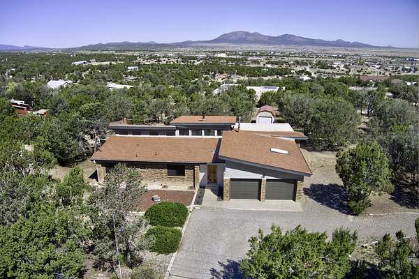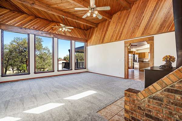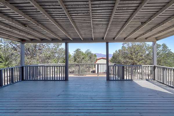 Spacious, light, and bright home with a functional open floor plan designed for comfort and entertaining. The living room features celestial windows, a cozy wood-burning stove, and stunning beamed tongue-and-groove ceilings, all overlooking the peaceful backyard. Enjoy expansive mountain views from the large deck -- perfect for gatherings or quiet NM sunsets. Beautiful foyer with ample storage, 3 bedrooms, 2 baths, and a bonus room off the kitchen, ideal for a home office. Updated kitchen with island and oak cabinets. Refrigerated air and owned water softener. Fully fenced 2-acre lot with three drive-in access points; horses allowed. A truly serene outdoor retreat! **Note floorplan bedroom 12x9'8 bedroom is jack & Jill to hallway from living area. Also what is labeled as a walk in closet