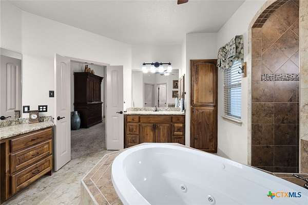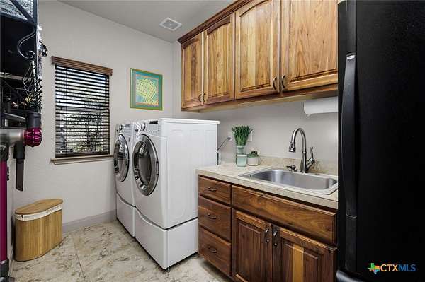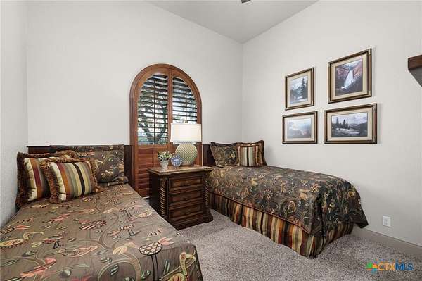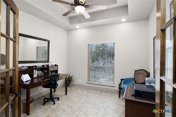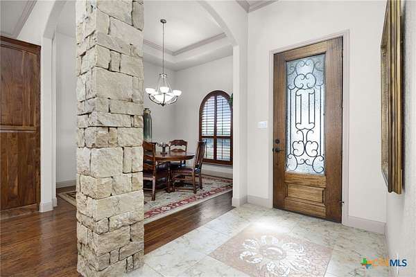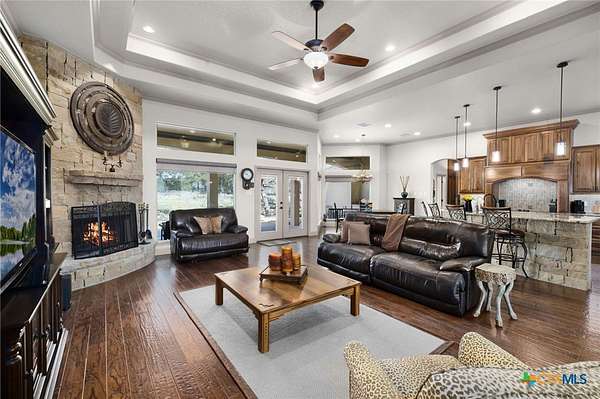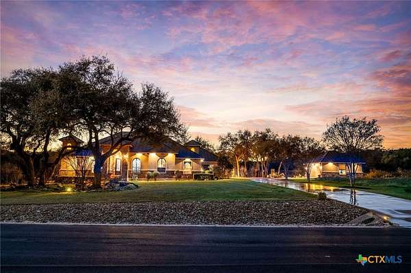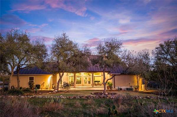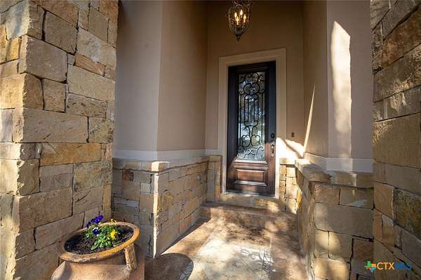 Nestled in the desirable guarded and gated community of Copper Ridge, this stunning residence boasts four spacious bedrooms and three and a half bathrooms. The open-concept layout is enhanced by impressive floor-to-ceiling windows that flood the living space with natural light and offer sweeping views of the beautifully manicured backyard oasis-complete with a sprinkler system and an extended patio featuring a built-in grill, perfect for entertaining. Throughout the home, rich walnut wood flooring adds warmth and sophistication. The kitchen dazzles with custom walnut cabinetry, gleaming granite countertops, top-of-the-line fixtures, and a striking stone-accented breakfast bar and backsplash. Modern conveniences abound, including a security system with glass breakage, an attached three-car garage, plus a versatile detached two-car garage for extra storage or hobbies. Residents enjoy premium community amenities: a sparkling pool, tennis courts, a sports court, and scenic jogging trails. All this, just steps from vibrant shops, lively bars, and delicious restaurants-and only minutes away from New Braunfels' top attractions.