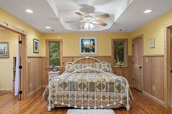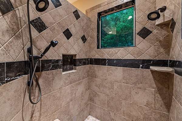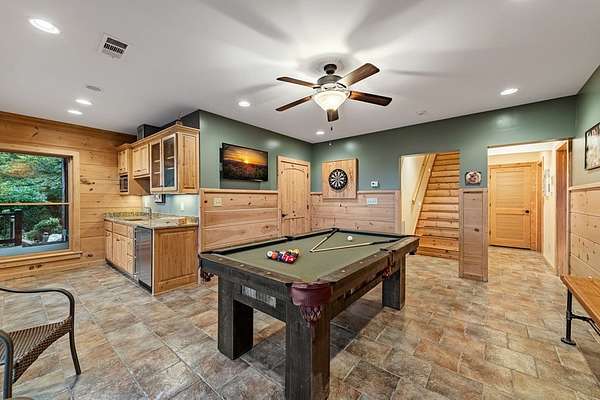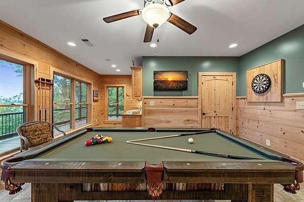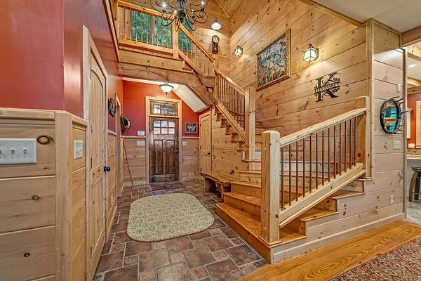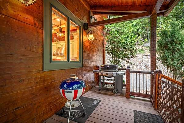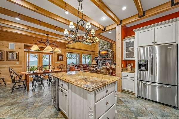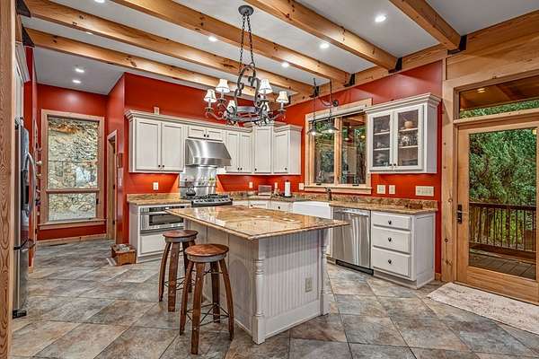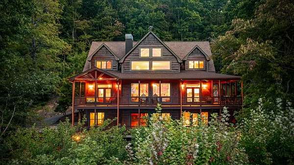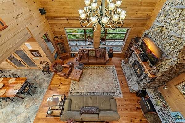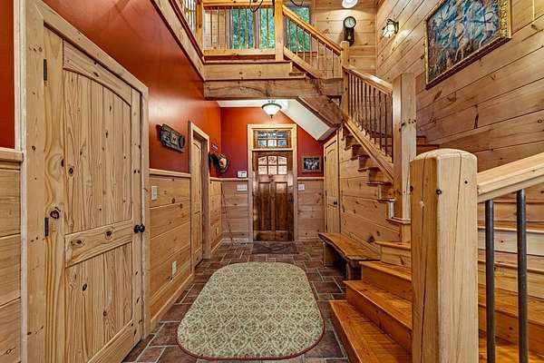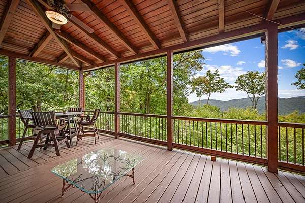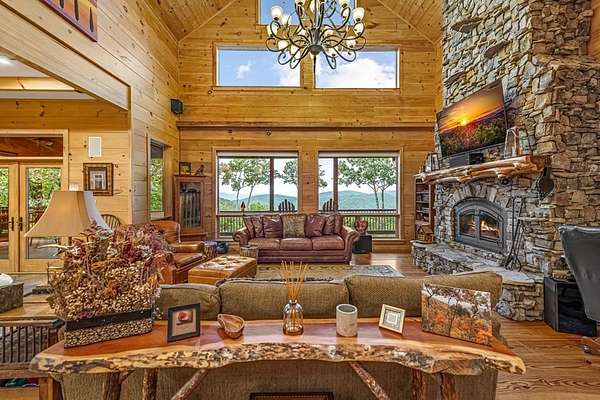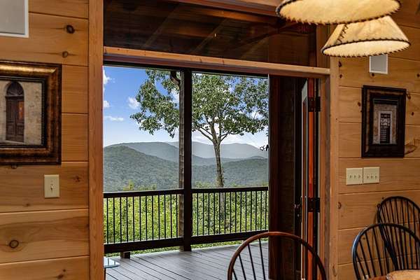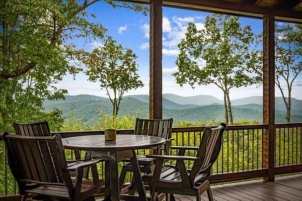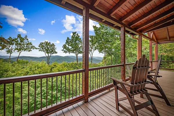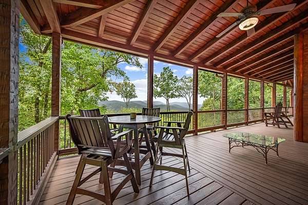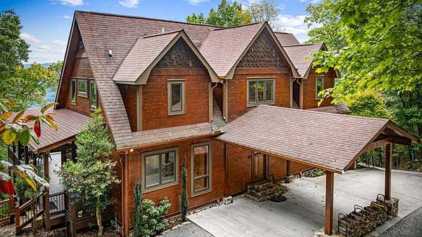 A Grand Lodge Retreat with Million-Dollar Views! Escape to a one-of-a-kind mountain retreat that feels like it belongs in a National Park. Set at the end of a private gravel road and bordering U.S. Forest Service land, this 4BR/4.5BA home blends rustic grandeur with modern comfort, offering rare privacy and sweeping year-round mountain views. Inside, you're welcomed by tile floors, a copper sink half bath, and timeless craftsmanship. The great room impresses with soaring beams, a massive stone fireplace with wood-burning insert, and a dramatic chandelier--creating a lodge-like space that's both awe-inspiring and inviting. The open kitchen and dining area features granite countertops, stainless appliances, gas range, pantry, and generous laundry. Multiple doors lead to expansive covered porches, perfect for savoring the views. The main-level primary suite boasts exposed beams, panoramic vistas, and a spa-like bath with double vanities, walk-in tile shower with dual heads, jetted tub, water closet, and large walk-in closet. Upstairs, a catwalk leads to two ensuite bedrooms with tiled showers--one with a bonus room for office, nook, or guest space. The terrace level offers a game room with pool table, wet bar, mini fridge, and another ensuite bedroom, plus access to more covered porches and a hot tub with mountain backdrop. A 2-car basement garage and front carport provide ample covered parking. Whether a private estate, family getaway, or luxury rental, this lodge-style retreat with million-dollar views is truly extraordinary.
