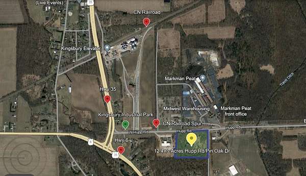 Prime acreage awaiting to be developed in the up and coming Kingsbury Industrial Park. Possibilities are unlimited with the property zoned M2 and located in the Kingsbury Industrial Park TIF District. This 12.4 acre site is located Kingsbury Industrial Park within the TIF district and is zoned M2-Heavy Industrial with unlimited potential. This site offers easy access to major throughways, within an hour of Chicago and can service the Midwest within a days time. The property is near the new CN railroad spur. The property would be suitable for heavy industrial, warehouse, distribution center, commercial ideas or develop into a subdivision. The site has access to utilities with municipal water and sewer available. The Industrial Park has over 20 square miles of park and 8000 acres with a variety of industrial businesses in operation today with CN, CSX and JBC railroads servicing this park. Address used is not the official address. Property is located at the corner of Hupp Rd and Pin Oak Drive, Kingsbury