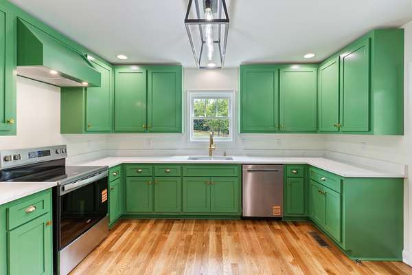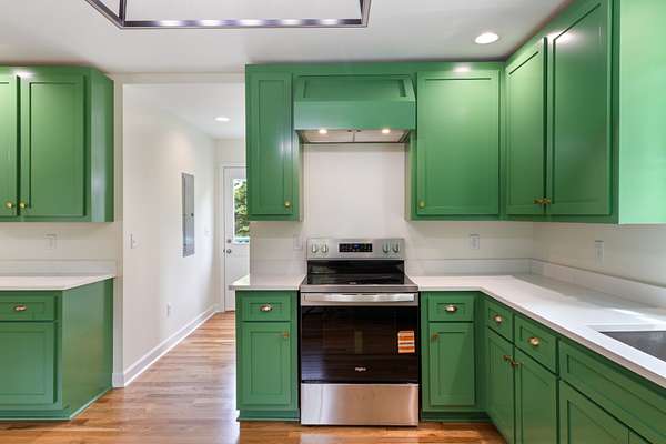 The kitchen is equipped with quartz countertops, stainless steel appliances, and ample cabinet space for storage.