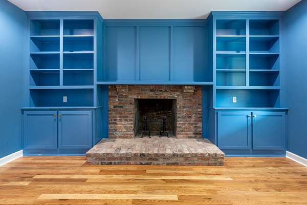 Huge living room featuring built-in shelving, contemporary fixtures, and a cozy fireplace, sand and finished hardwood floors, elegant and modern kitchen as well as generous upstairs media/family room.
