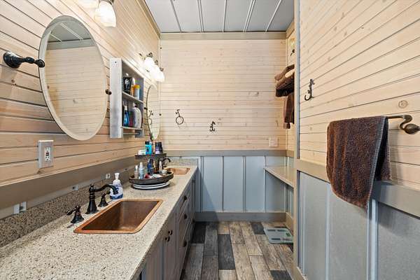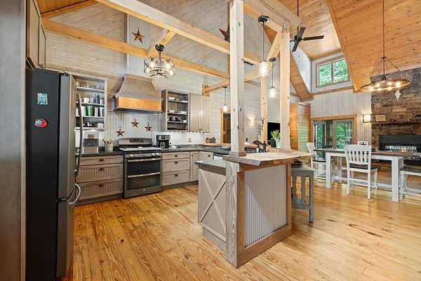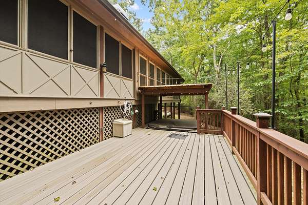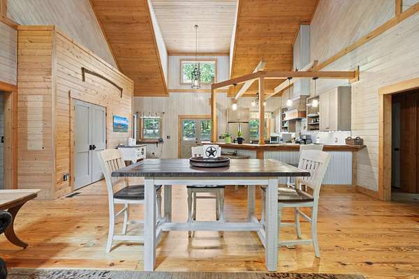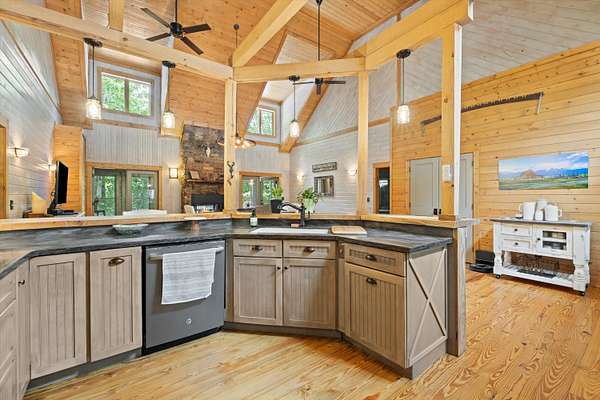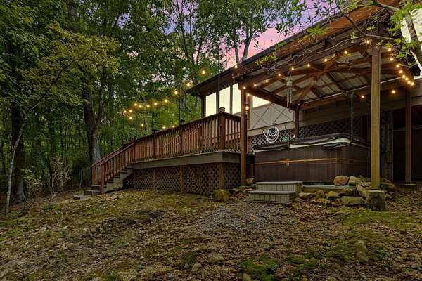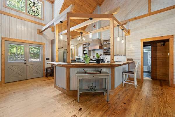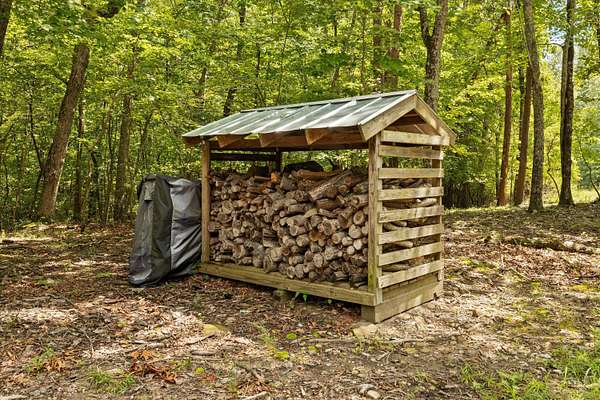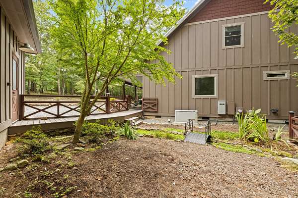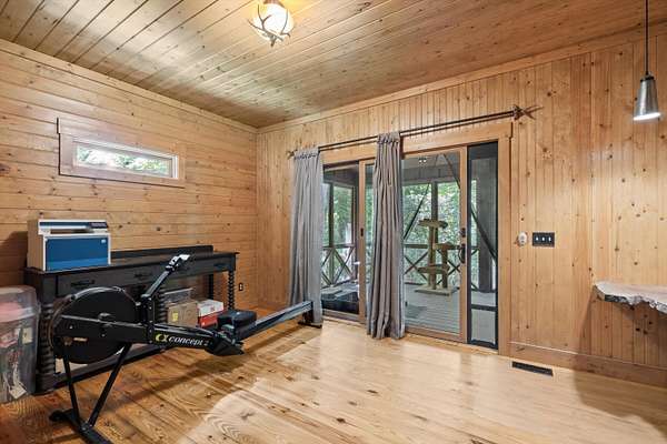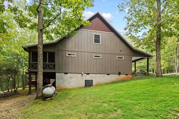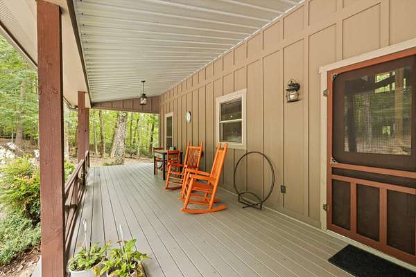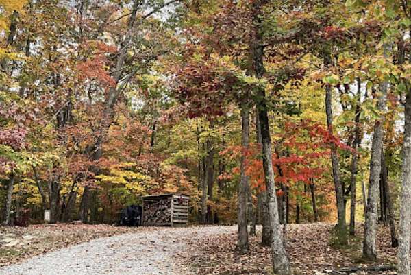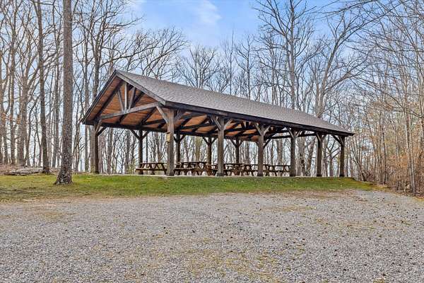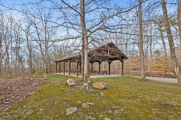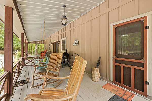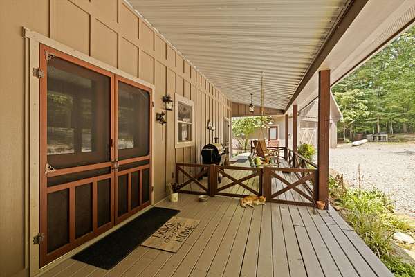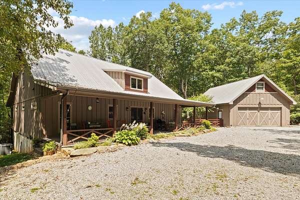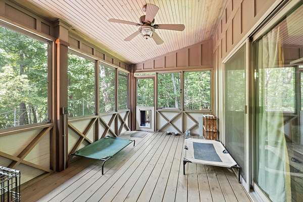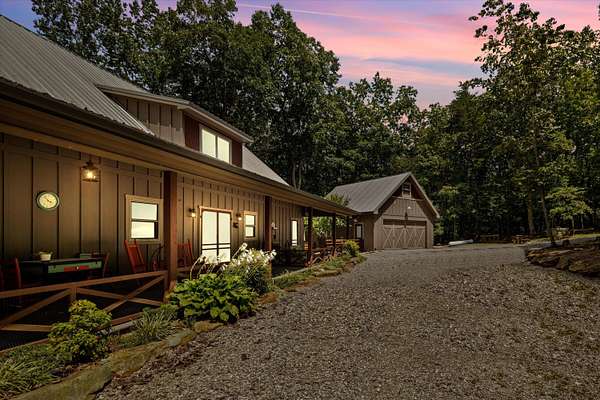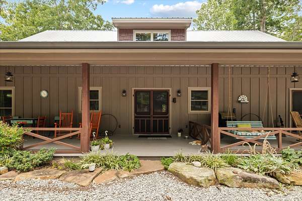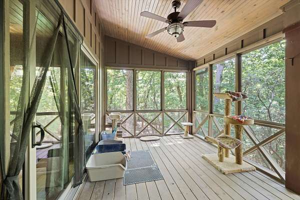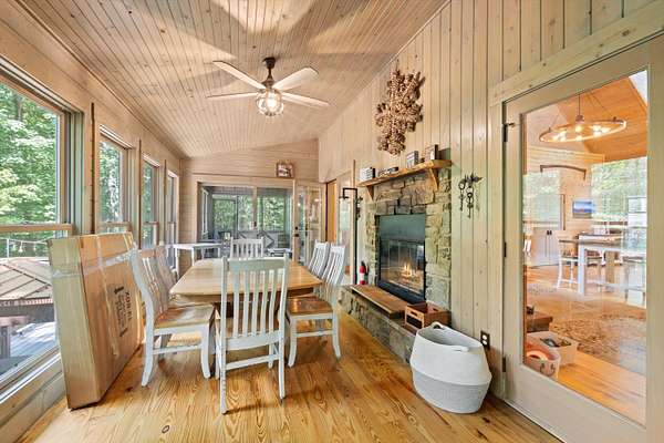 Welcome to your private retreat! Nestled on 12 wooded acres in a quiet cul-de-sac, this gated 3 bedroom, 2 bath ranch home offers the perfect blend of comfort and outdoor living. A circular drive leads to the inviting country front porch, perfect for rocking chairs. Inside, the vaulted-ceiling living room features a stunning mountain stone see-through gas fireplace that also warms the cozy sun porch. The kitchen boasts stainless steel appliances and flows seamlessly for entertaining. The spacious master suite includes a spa-like bath with double sinks, soaking tub, separate shower, and walk-in closet. Enjoy two screened-in porches, a large laundry room with storage, and a two-car garage. Outdoors you'll find a private back deck with hot tub, an astroturf area for pets, an amazing firepit, a pavilion with picnic tables, endless hiking trails, and a short walk to the lake for fishing. Truly one-of-a-kind!