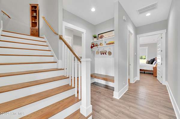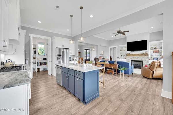 - Ceiling Fan(s), Entrance Foyer, Gas Log, High Ceilings, Kitchen Island, Master Downstairs, Pantry, Solid Surface, Walk-In Closet(s), Walk-In Shower, Whole-Home Generator