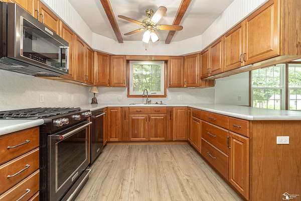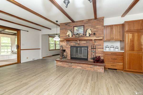 one of a kind, ranch on ranch, be natures neighbor, nestled between the pines custom built on the side of the hill walk out lower. : has separate drive and lower entry Horse Farm, 11.85 Acres, 45x80, 3680 sq ft barn with tack room and stalls, fenced grazing, pasture and trails, custom built brick ranch newer kitchen and baths, newer windows lift into clean, newer flooring and fresh paint, finished walk out lower level partially above grade level, could be additional living for extended family. or friends 4-bedroom, 2.5 baths, attached 24 x 26 garage, 45 x 80 barn. new wood flooring, move in ready, 2 woodburning brick fireplaces, whole house Generac generator, Florida room has newer Anderson windows. scenic views from every window, watch nature and seasons change Farm UTILITY BUILDINGS, custom chicken building, 2 brand new electric fence. Excellent water leased "water boy system" Public water at street and all assessments paid in full. Easy access to US 223 move in at close, seller would consider LC with 450K down