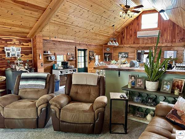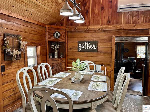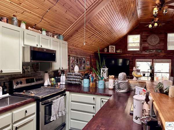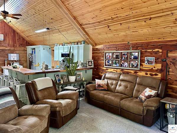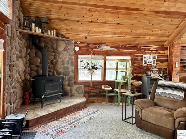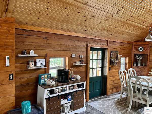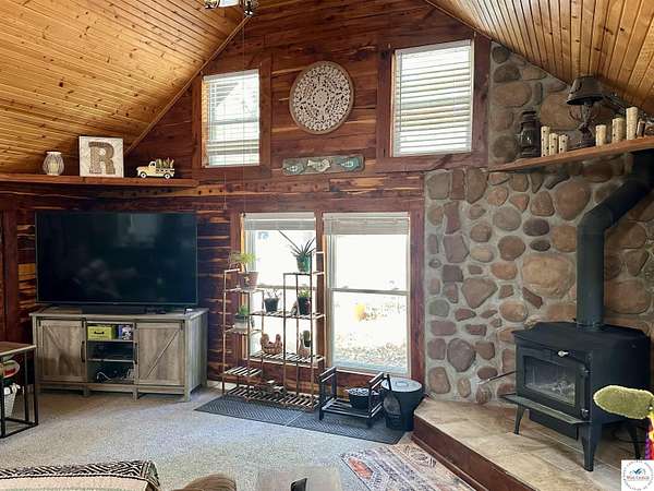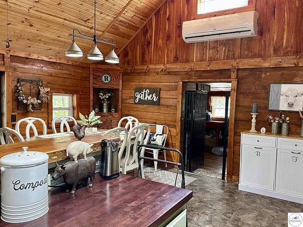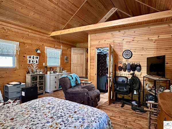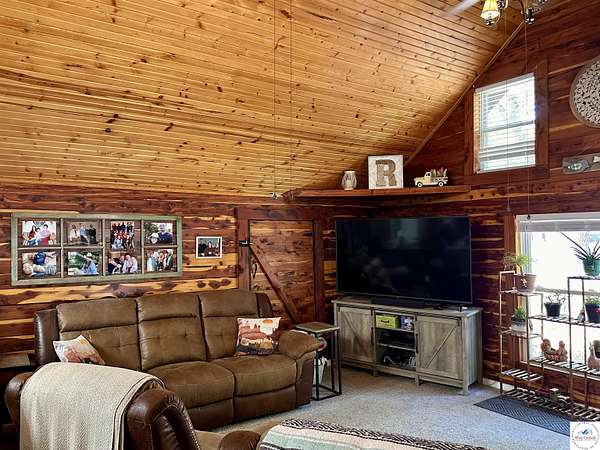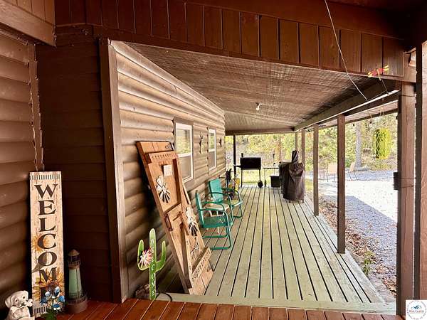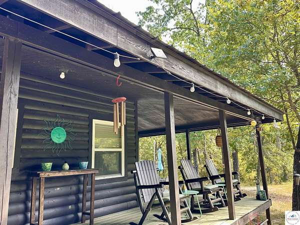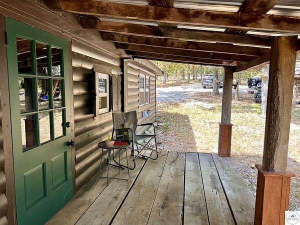 Awesome Hunters Retreat on 10 Acres. Custom log cabin built with the wood from the original property, wrap around porches with views of the pond and multiple trails cut thru out the property. Large kitchen and living room area with vaulted wood ceilings and stainless steel appliances. Wood stove in living room. Second bedroom made into utility room but could easily be turned back and move laundry into master closet. No restrictions. New septic and private well. Bring your 4-wheeler and the kids. Great 24x72 shop building made like a saloon with electric, water and sewer ran to it and some supplies to make an extra living quarters or guest house with concrete in the open bays on outbuilding. RV spot with electrical, sewer clean out and water for a camper. What a place to call your own! Now is the time to live your dream!