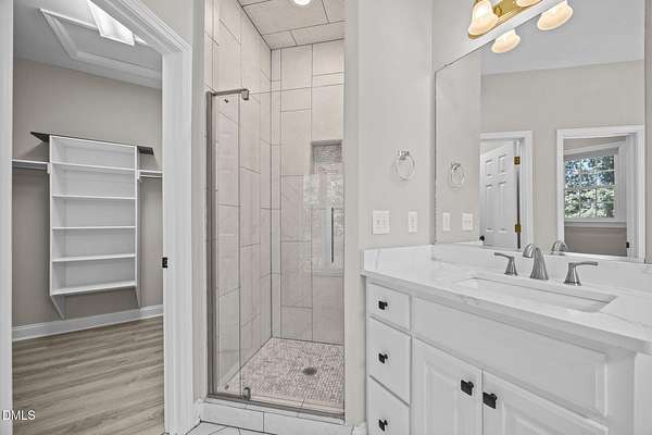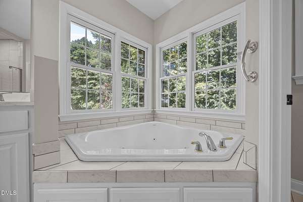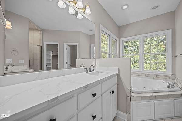 - Bookcases, Breakfast Bar, Cathedral Ceiling(s), Ceiling Fan(s), Eat-In Kitchen, Entrance Foyer, Kitchen Island, Pantry, Primary Downstairs, Quartz Counters, Smooth Ceilings, Soaking Tub, Walk-In Closet(s), Walk-In Shower