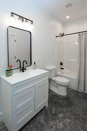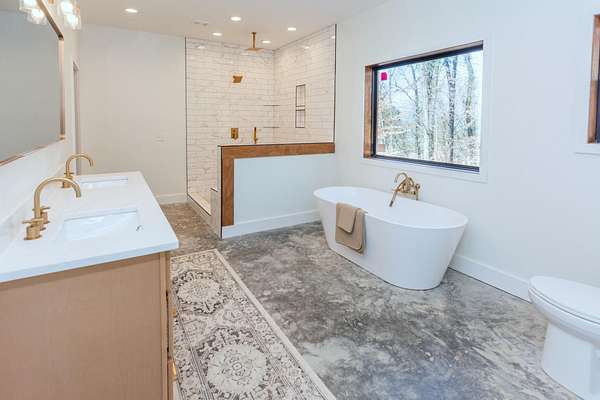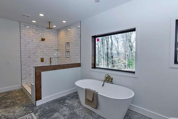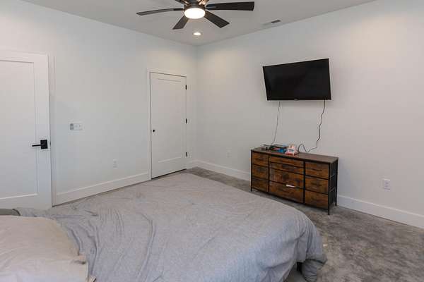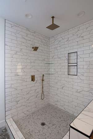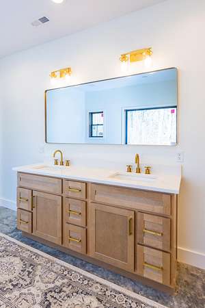 The master suite is a true retreat, complete with a spacious walk-in closet that includes a safe room for added peace of mind. Pamper yourself in the lavish master bath, featuring a stunning waterfall rain shower and a relaxing soaker tub, creating a spa-like experience right at home.