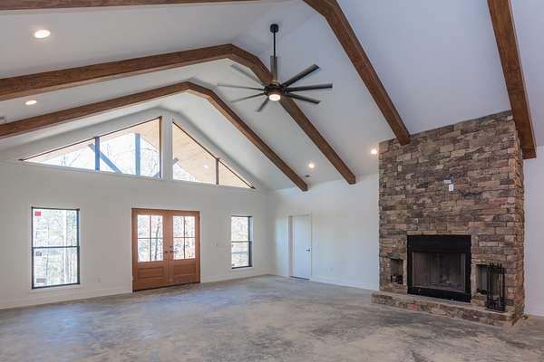 As you step inside, you'll be greeted by an open floor plan that seamlessly integrates the living, dining, and kitchen areas, flooded with abundant natural light from oversized windows. Indulge in the warmth of the wood-burning fireplace and wood beamed ceilings are perfect for cozy evenings.