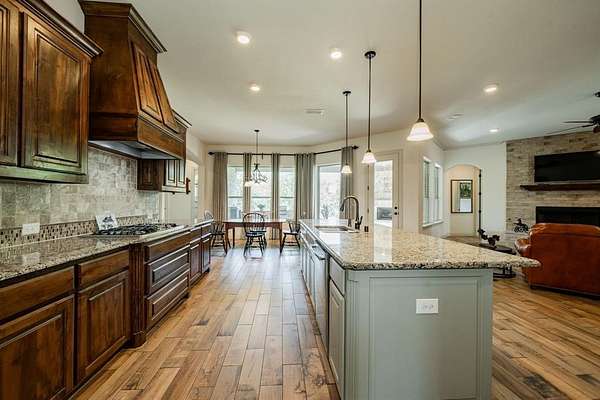 The intelligently designed floorplan features a spacious in-law suite layout and a 3-car garage. A dedicated study with built-ins and French doors provides privacy, while the open-concept living, kitchen, and breakfast areas create an inviting space for everyday living and entertaining. The gourmet kitchen boasts a large island with sink, extra prep space, and a versatile flex area that can serve as a butler's pantry.
