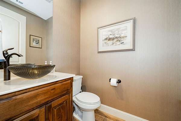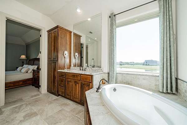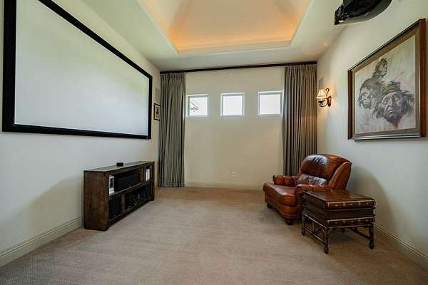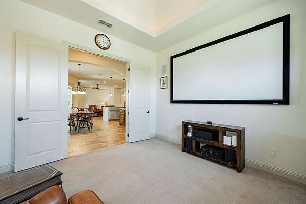Additional highlights include a stone fireplace in the living room, a generously sized media room complete with projector and equipment, and a well-appointed formal dining or second living area. The luxurious primary retreat overlooks the trees and offers a spa-like bath with oversized garden tub, dual vanities, large walk-in shower, and an expansive closet. Secondary bedrooms are thoughtfully arranged, with two sharing a full bath and a private guest suite with its own bath tucked away.