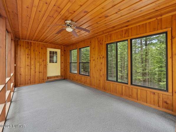 - Beamed Ceilings, Cedar Closet(s), Ceiling Fan(s), Eat-In Kitchen, High Ceilings, Laminate Counters, Pantry, Tile Counters, Tub Shower Combo, Untextured Ceilings, Vaulted Ceiling(s)