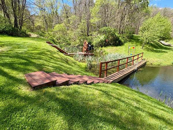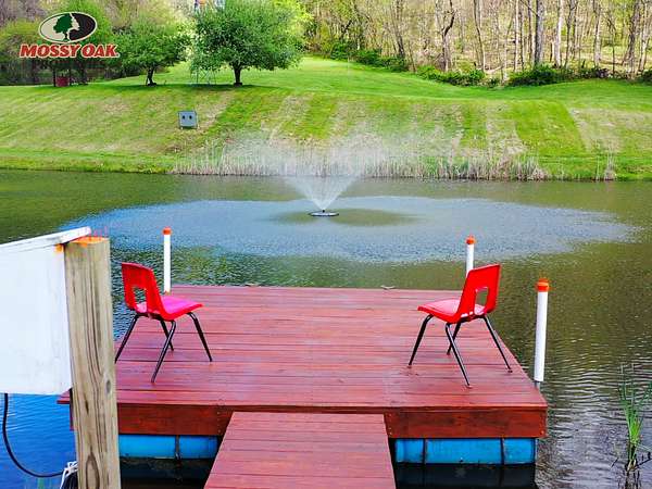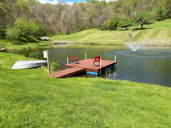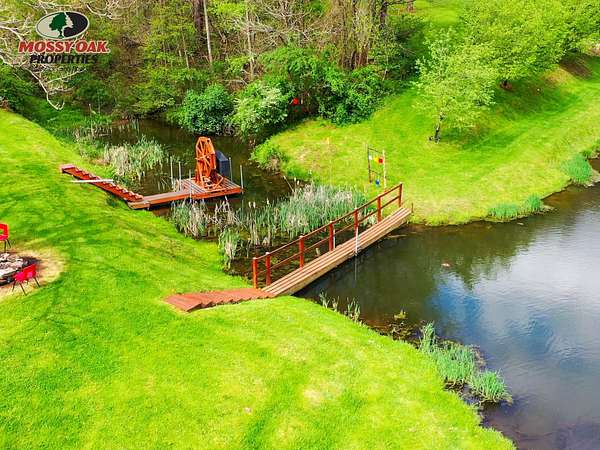 The land itself is a true outdoor enthusiast's dream. A private, aerated lake-accented by a picturesque windmill-serves as a stunning centerpiece, complete with a walking bridge, floating dock, and large fire pit for gathering. In addition, a separate stocked pond features a boat and fishing dock, ideal for quiet days on the water.