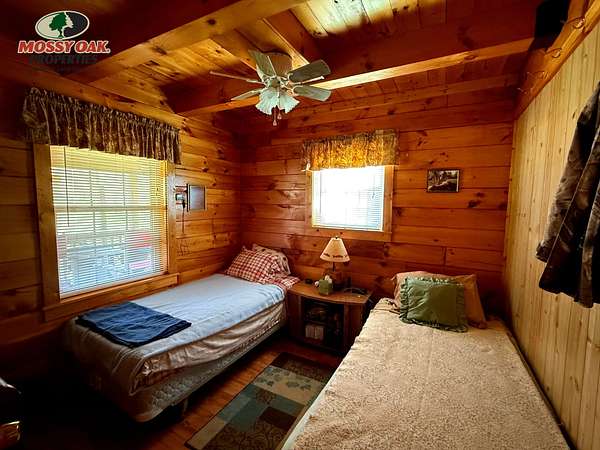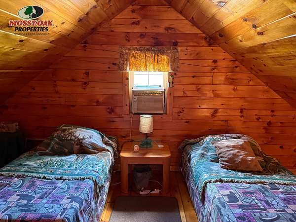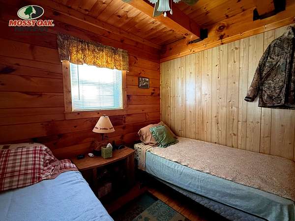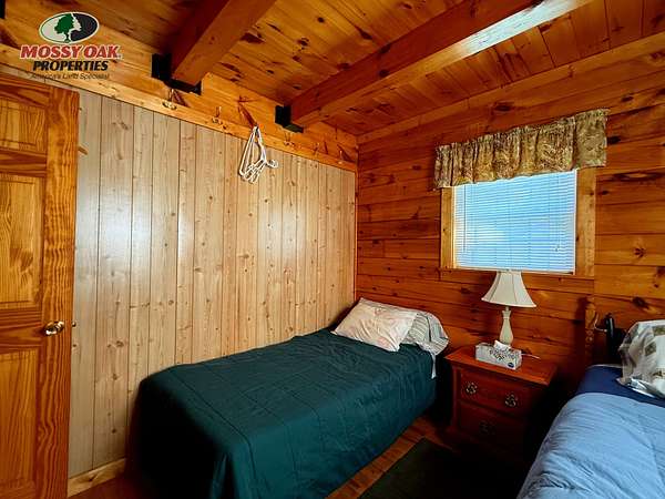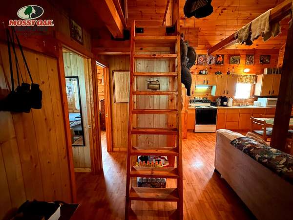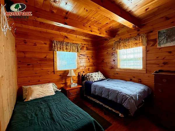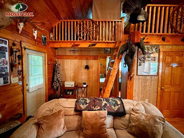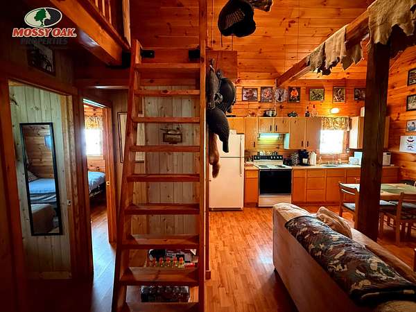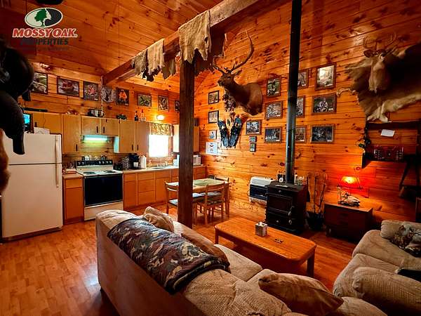 Built in 2003, the charming 2-bedroom, 1-bath log cabin showcases a warm pine tongue-and-groove interior, exposed timber frame beams, and durable laminate flooring throughout. A covered front porch provides the perfect spot to unwind and take in the peaceful surroundings.