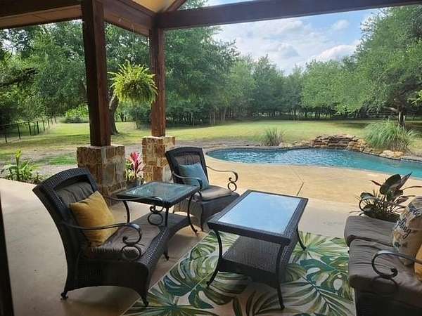 Amazing opportunity to own a beautiful custom home on 22.8 acres. Very secluded & private. Fully fenced with awesome horse barn (50x60) with 5 stalls,30x50 shop with apt & brand new shop (40x30) with carport. Shops are well insulated with elec & water. Home is energy efficient with foam insulation throughout. Awesome floor plan with lovely wood flooring. Master BR & 2nd BR with full bath down. Master BR features French doors to back patio, trey ceiling, fp, walk-in closet, garden tub, large tile shower, sep vanities. Formal dining & custom study. Kitchen, with granite, tons of cabinets, walk-in pantry & beautiful tile floor, opens to spacious LA with fp & wall of windows overlooking large, cov patio & sparkling pool. 3rd BR with full bath & game room upstairs. Addl room off the game room also could be 4th BR. Tankless wh, 10’ dbl mahogany entry doors, decked attic space. Owner is installing new Liftmaster electronic gate at the entrance. New roof, new pool equipment, new tankless water heater. 21.8 acres is currently ag exempt. No restrictions.