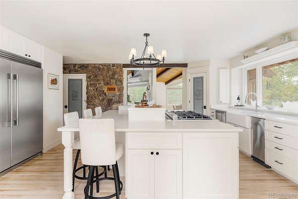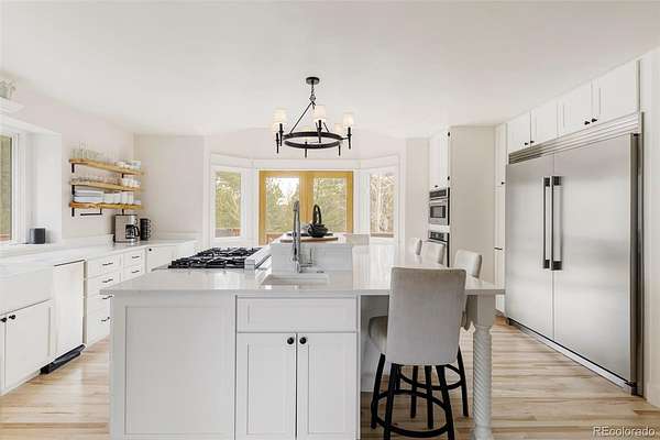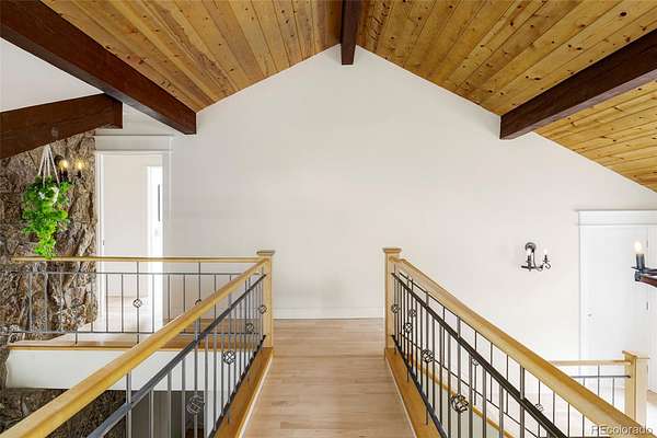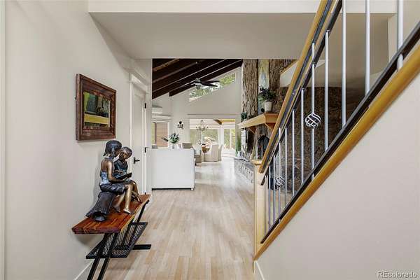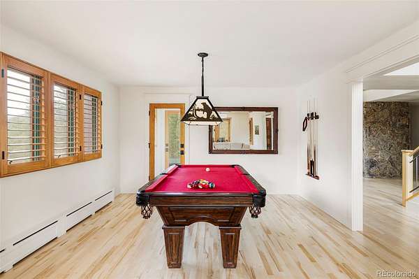 Experience the pinnacle of Colorado luxury in this beautifully remodeled mountain estate, situated on four-and-a-half fully fenced acres with absolute privacy and unimpeded, breathtaking views of Mt. Blue Sky (formerly Mt Evans). The main level serves as the home's grand heart, featuring soaring vaulted ceilings and a floor-to-ceiling stone fireplace in the oversized living room. The spacious gourmet chef’s kitchen with quartz countertops flows into a stunning dining room with oversized west-facing windows, while a second large flex room currently serves as a stylish pool table room. A wine closet with a custom iron gate door completes this level, all anchored by rich hardwood floors.