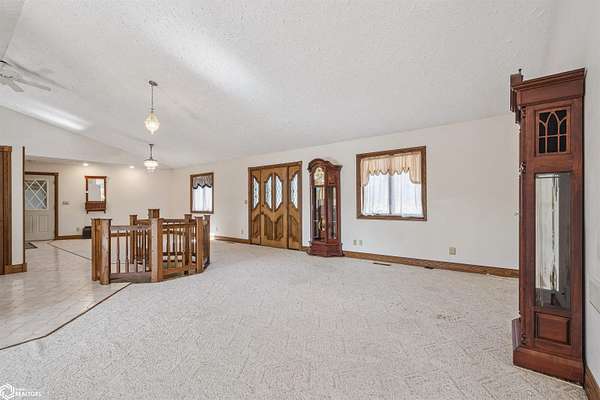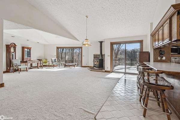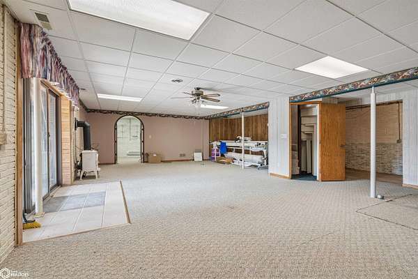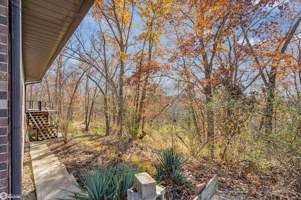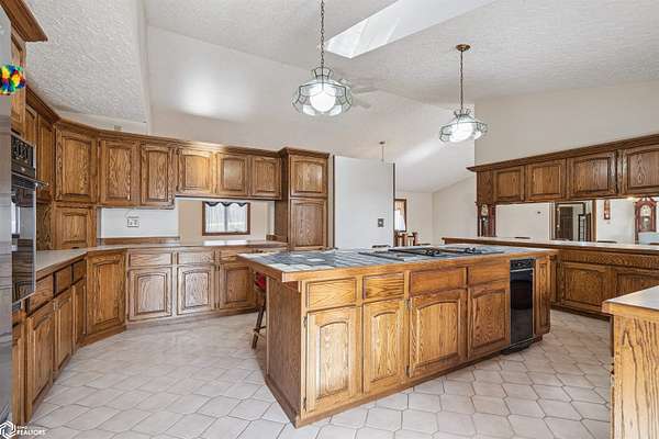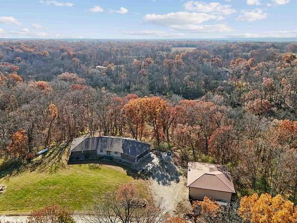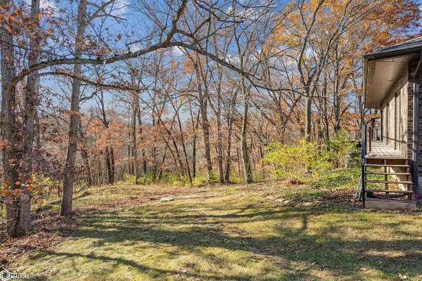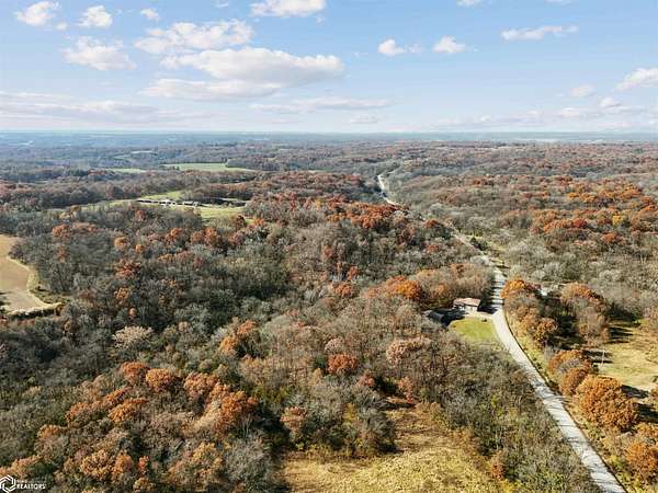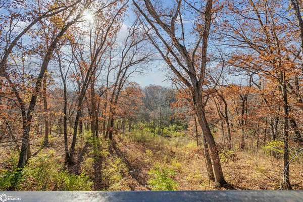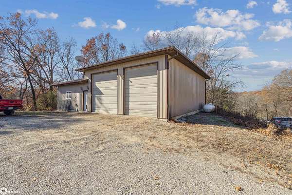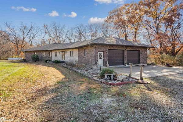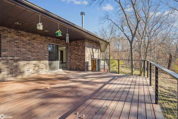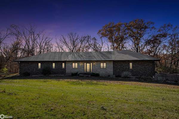 Tucked away on approximately 18 wooded acres in Danville, Iowa, this beautifully crafted, full brick exterior, ranch-style home offers privacy, quality construction, and exceptional versatility. Surrounded by natural views, the setting feels secluded while still providing the comfort of a thoughtfully designed home and an impressive shop building ready for work or play. The main level features an open-concept kitchen and living area with vaulted ceilings, skylights, and abundant natural light. Custom cabinets from Colorado, a large island, quality appliances, and generous storage make the kitchen both functional and inviting. The living room is anchored by a substantial wood-burning stove and opens to a composite deck with wire railings overlooking the peaceful back acreage. All of the woodwork and 6 panel doors are solid oak, that were hand finished by the original owner. The primary suite offers direct deck access, a spacious walk-in closet, and a unique vanity layout that adds both convenience & character. Additional bedrooms, baths, and an oversized laundry room complete the main level. The walkout lower level was built with strength in mind and provides expansive living space, a three-quarter bath, additional bedroom area, and massive storage. Unique historic-style glass doors add a one-of-a-kind touch rarely found in homes like this. A standout feature is the large shop with oversized doors and a loft, ideal for hobbies, equipment, or serious workspace needs.