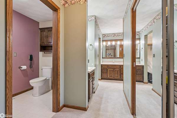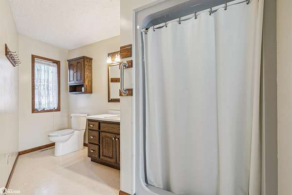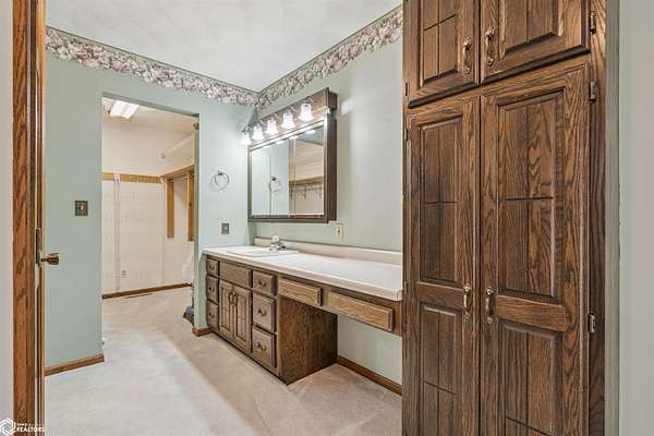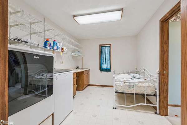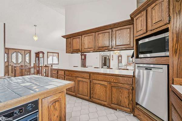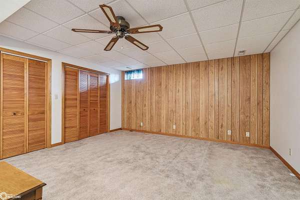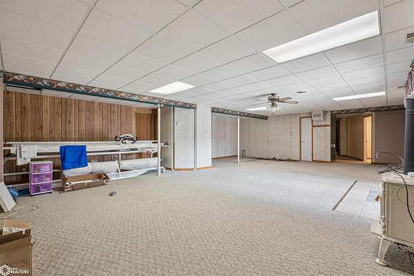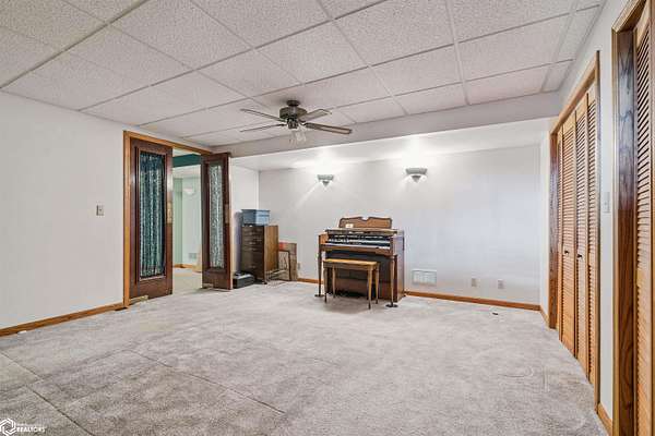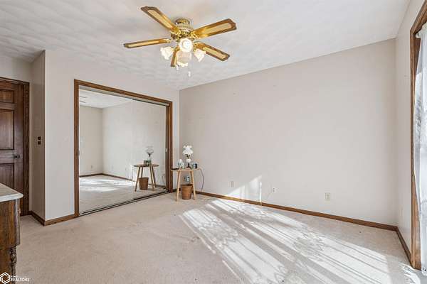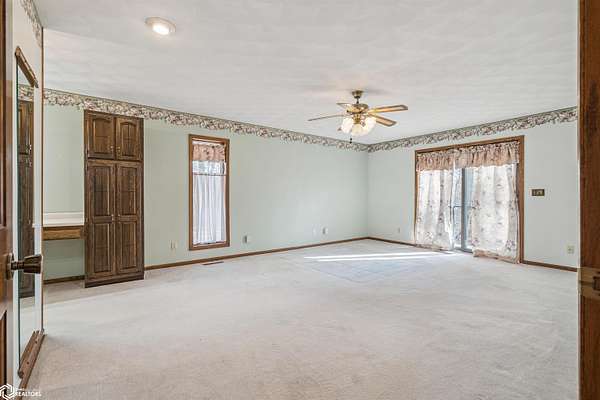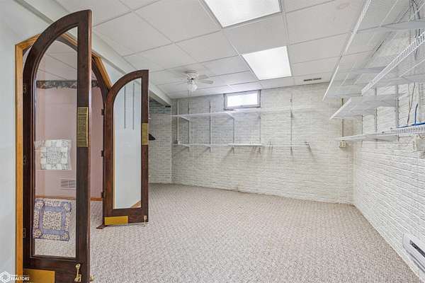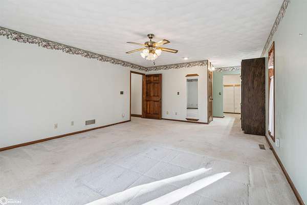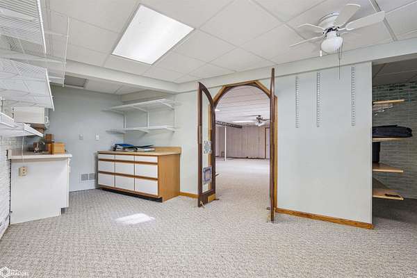 Tucked away on approximately 18 wooded acres in Danville, Iowa, this beautifully crafted, full brick exterior, ranch-style home offers privacy, quality construction, and exceptional versatility. Surrounded by natural views, the setting feels secluded while still providing the comfort of a thoughtfully designed home and an impressive shop building ready for work or play. The main level features an open-concept kitchen and living area with vaulted ceilings, skylights, and abundant natural light. Custom cabinets from Colorado, a large island, quality appliances, and generous storage make the kitchen both functional and inviting. The living room is anchored by a substantial wood-burning stove and opens to a composite deck with wire railings overlooking the peaceful back acreage. All of the woodwork and 6 panel doors are solid oak, that were hand finished by the original owner. The primary suite offers direct deck access, a spacious walk-in closet, and a unique vanity layout that adds both convenience & character. Additional bedrooms, baths, and an oversized laundry room complete the main level. The walkout lower level was built with strength in mind and provides expansive living space, a three-quarter bath, additional bedroom area, and massive storage. Unique historic-style glass doors add a one-of-a-kind touch rarely found in homes like this. A standout feature is the large shop with oversized doors and a loft, ideal for hobbies, equipment, or serious workspace needs.