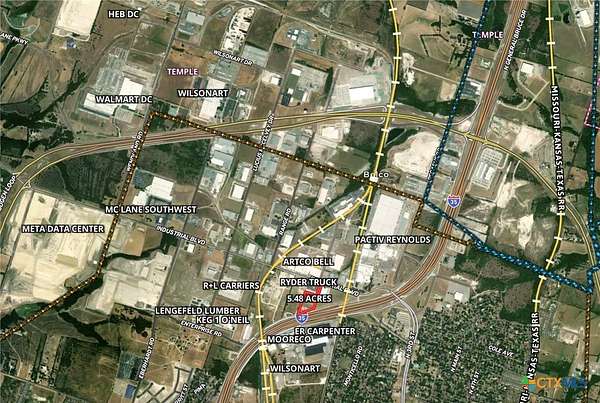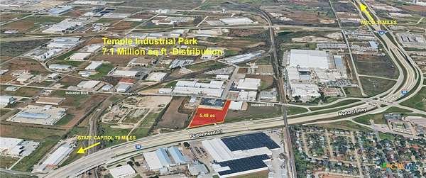 508 feet of frontage on IH-35 with great visibility. This 5.48 acre platted industrial lot has direct access to both IH-35 and Industrial Blvd at the gateway to the Temple's booming Industrial Park with over 7M sq ft of warehouse and distribution. Lot is surrounded by major industrial users and distribution centers, traffic count 80,000 VPD. All utilities on site. In addition to warehouse/distribution, it is great for truck services, truck parking, dealerships, hospitality, gas, retail, storage, service center, or personal warehouse. Seller intends a 1031 exchange.