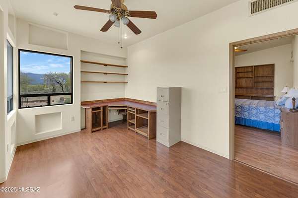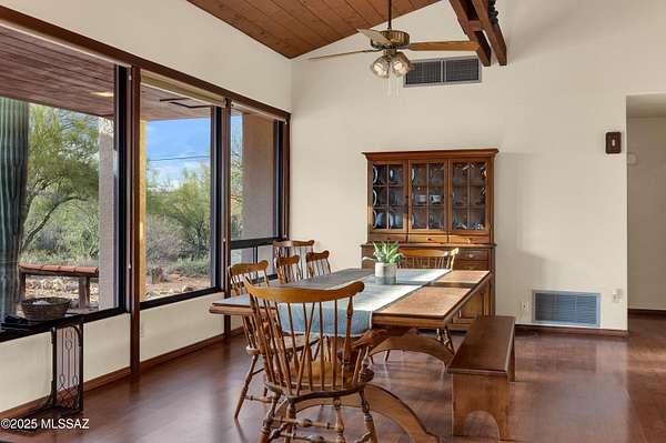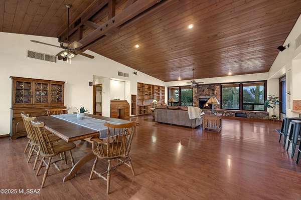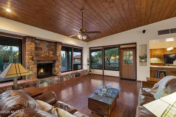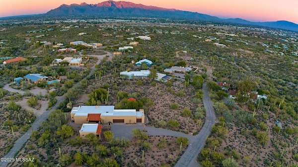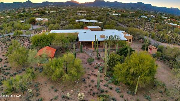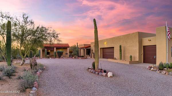 Discover comfort, versatility, and true desert serenity on this exceptional 2.02-acre Santa Fe-style estate, complete with a charming Guest House and two 1-acre contiguous lots, a rare opportunity offering enhanced privacy, future resale flexibility, or an appealing long-term investment. With NO HOA, this property invites a lifestyle defined by freedom and connection to the natural landscape. Custom-built by its original owner, renowned for impeccable craftsmanship and perfectionist standards, the home captures authentic Southwest character. High wood-beam ceilings, rich wood floors, and expansive windows create a bright, inviting interior anchored by a dramatic stone fireplace that sets the tone for relaxed desert living. The spacious bedrooms, along with a dedicated office featuring built-in bookshelves, offer comfort and thoughtful functionality for working or unwinding at home. The separate Guest House is a standout feature, offering visitors or extended family their own private oasis with a full kitchen, living area, and bathan ideal blend of independence and connection to the main residence. For hobbyists and creatives, the property includes a generous workshop equipped with water and electricity, perfect for automotive projects, woodworking, crafts, or storage. Outdoor living is just as impressive, with amenities designed for both enjoyment and exploration: a BBQ hut/ramada, a peaceful cement wildlife pond, dog run with water access, horseshoe pit, basketball hoop, and meandering walkways that encourage you to roam the grounds. The expansive patio becomes the heart of everyday living and entertaining, capturing breathtaking mountain and city views while offering unmatched privacy. Whether relaxing quietly at sunset or hosting loved ones, this space embodies effortless desert living. All of this is just minutes from local conveniences, hiking, downtown Tucson, Starr Pass, and the University of Arizona, offering the perfect balance of tranquility and accessibility. Price reflects the combined offering of the home and the adjacent acre. See the map in the documents section for details.