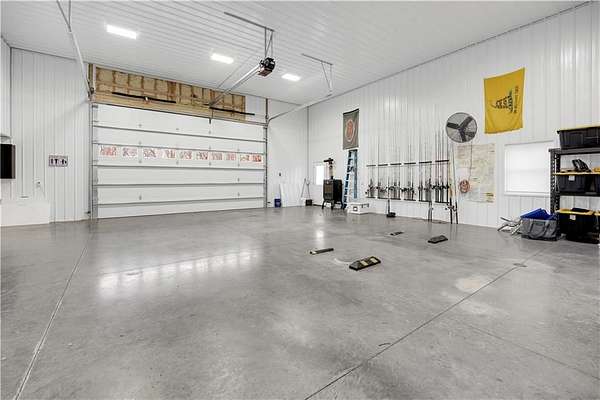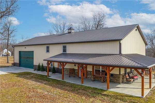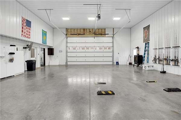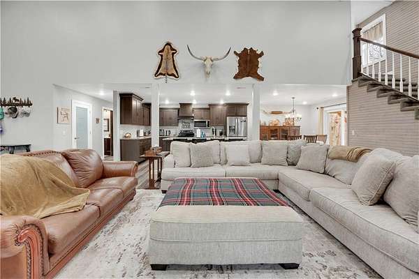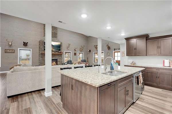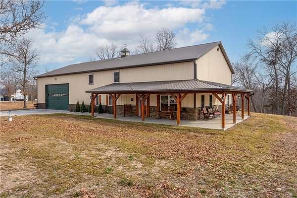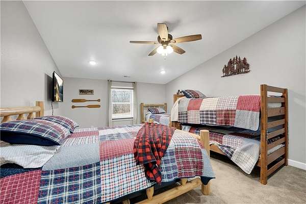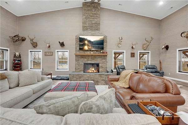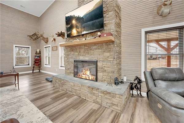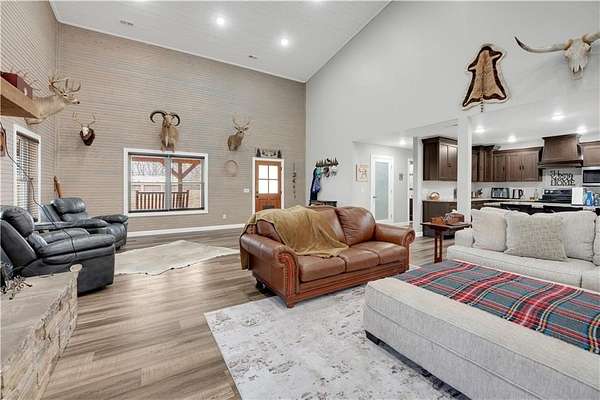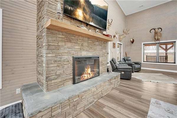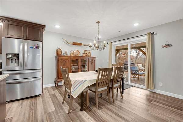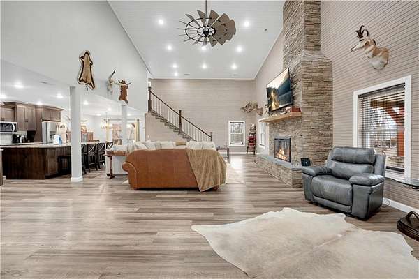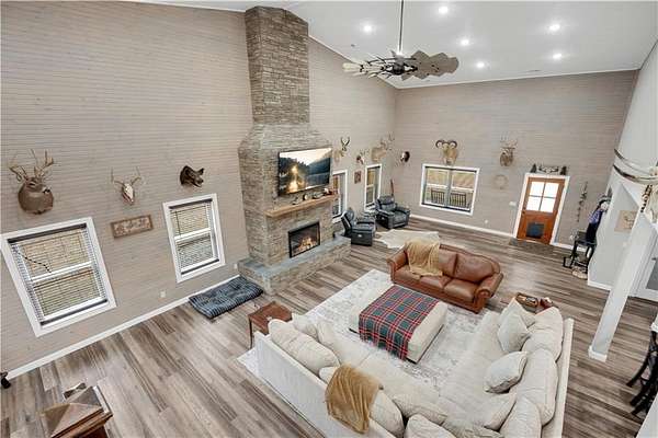 This expansive residence in Warsaw, MO, offers a harmonious blend of rustic charm and modern luxury. The two-story home boasts 4 bedrooms and 5 bathrooms, providing ample space for comfortable living. The heart of the home is the gourmet kitchen, featuring rich wooden cabinetry, granite countertops, and stainless steel appliances. The open concept layout seamlessly connects the kitchen to the dining and living areas, ideal for entertaining. The living room features a beautiful fireplace with floor to ceiling stone. Throughout the home, attention to detail is evident in the use of high-quality materials such as LVP floors, wood paneling, and decorative light fixtures. The property also includes practical spaces like a dedicated laundry room, walk-in pantry, and utility/storage rooms. Large windows offer views of the surrounding landscape, while a covered porch and deck provides outdoor living space. Newly installed oversized single overhead garage door will make storing your boat and toys as breezy as a spring day on the water! Each bedroom is generously sized and offers ample space for differing sleeping scenarios. Each room is thoughtfully designed with plush carpeting, ceiling fans, and ample natural light. The bathrooms showcase contemporary fixtures and finishes, including wood-look tile flooring and custom vanities. The home's design seamlessly blends rustic elements with modern conveniences, creating a warm and inviting atmosphere perfect for both everyday living and hosting gatherings. Don't miss this custom lake retreat!!
