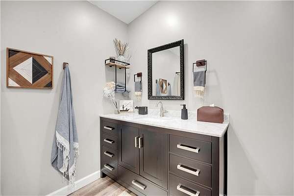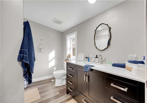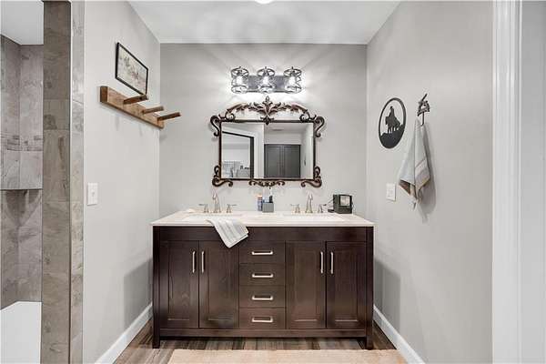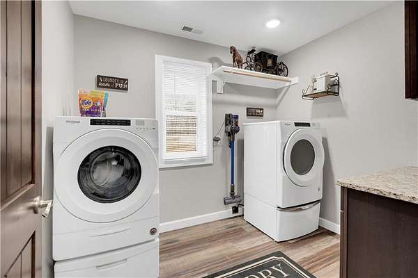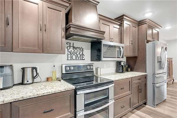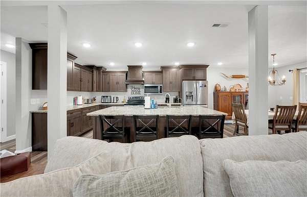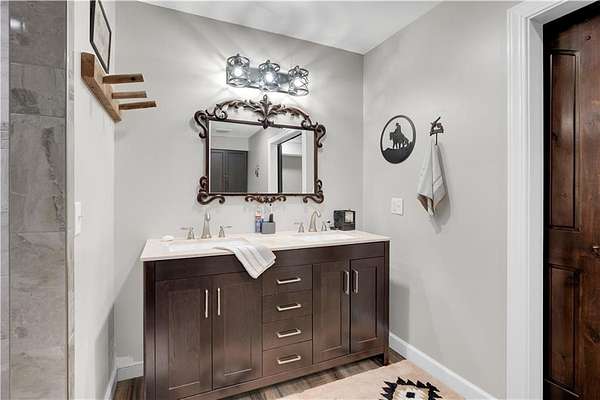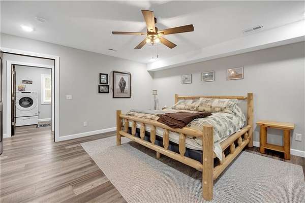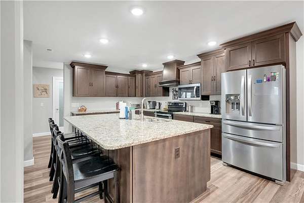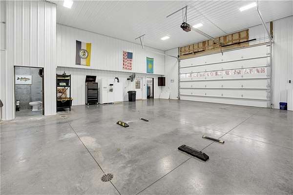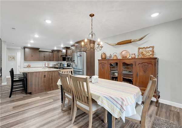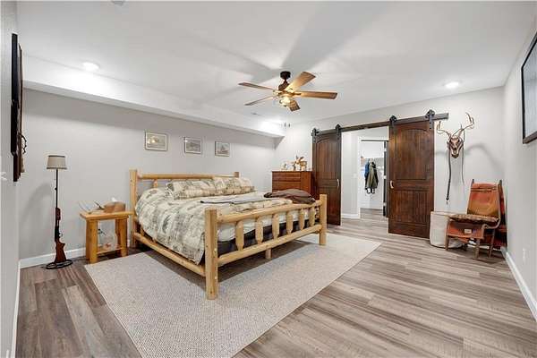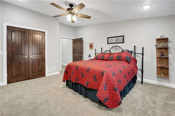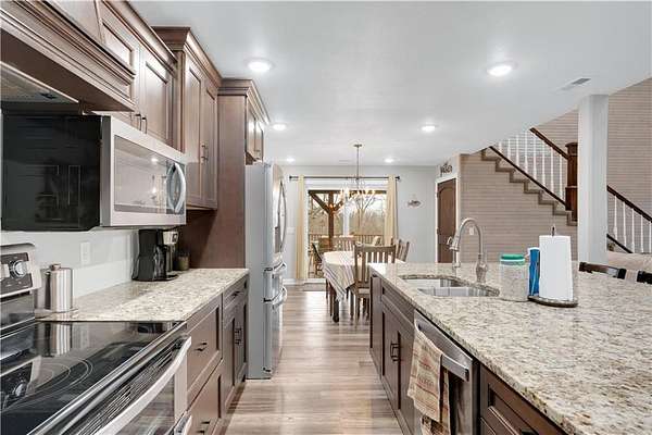 This expansive residence in Warsaw, MO, offers a harmonious blend of rustic charm and modern luxury. The two-story home boasts 4 bedrooms and 5 bathrooms, providing ample space for comfortable living. The heart of the home is the gourmet kitchen, featuring rich wooden cabinetry, granite countertops, and stainless steel appliances. The open concept layout seamlessly connects the kitchen to the dining and living areas, ideal for entertaining. The living room features a beautiful fireplace with floor to ceiling stone. Throughout the home, attention to detail is evident in the use of high-quality materials such as LVP floors, wood paneling, and decorative light fixtures. The property also includes practical spaces like a dedicated laundry room, walk-in pantry, and utility/storage rooms. Large windows offer views of the surrounding landscape, while a covered porch and deck provides outdoor living space. Newly installed oversized single overhead garage door will make storing your boat and toys as breezy as a spring day on the water! Each bedroom is generously sized and offers ample space for differing sleeping scenarios. Each room is thoughtfully designed with plush carpeting, ceiling fans, and ample natural light. The bathrooms showcase contemporary fixtures and finishes, including wood-look tile flooring and custom vanities. The home's design seamlessly blends rustic elements with modern conveniences, creating a warm and inviting atmosphere perfect for both everyday living and hosting gatherings. Don't miss this custom lake retreat!!