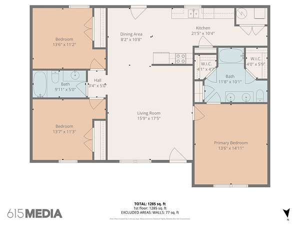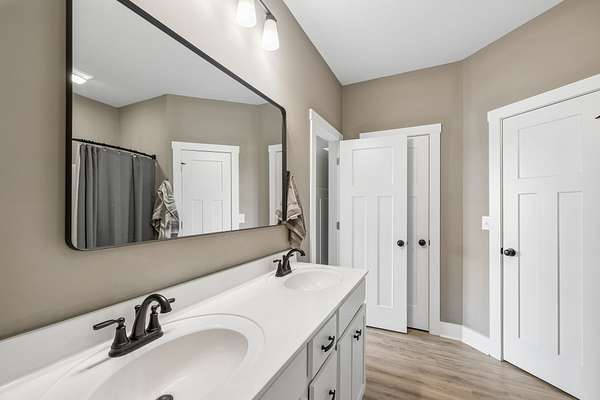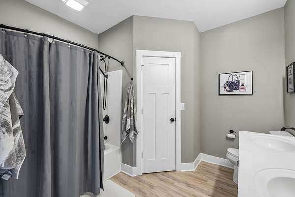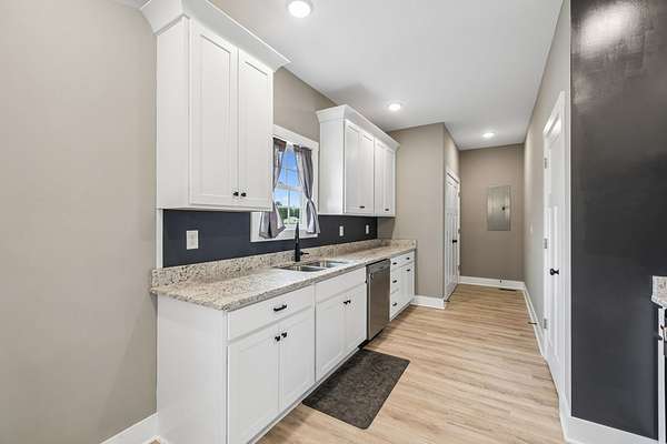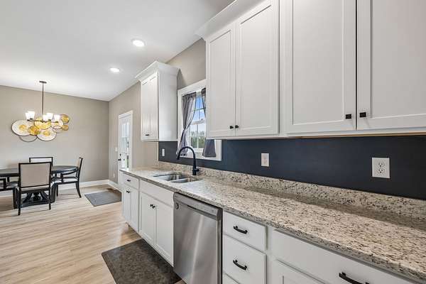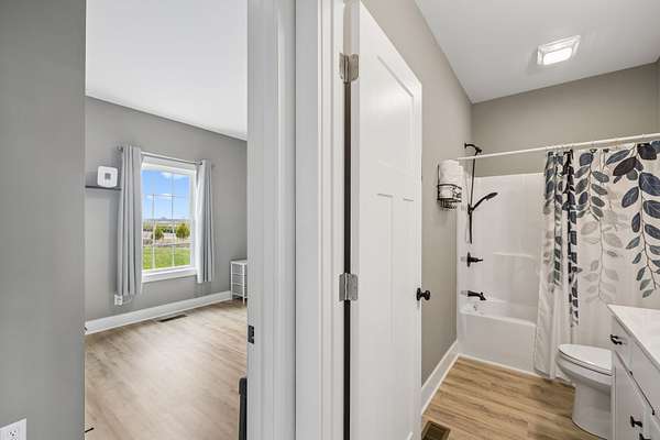 The home offers a welcoming front porch that leads into a spacious living area and a functional kitchen with ample cabinetry and workspace. The split-bedroom floor plan provides privacy, with a primary suite featuring its own full bathroom, while two additional bedrooms share a second full bath.