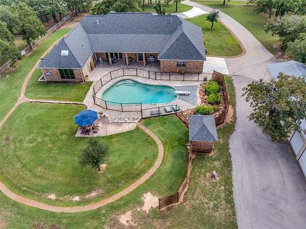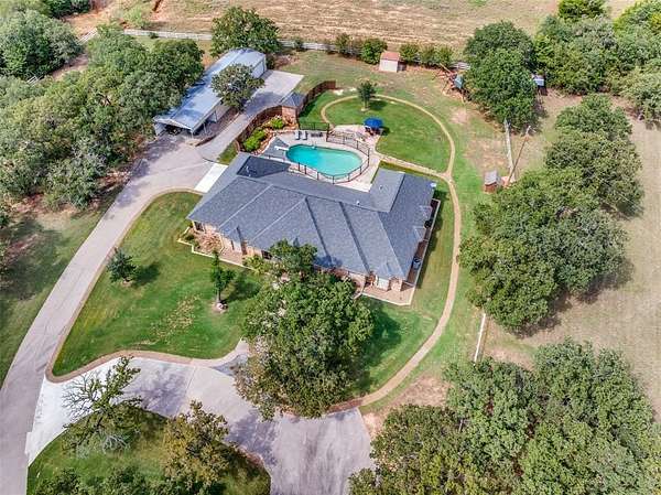 Beautifully maintained home and property originally constructed as the personal residence of Milton Neighbors of Neighbors Custom Homes. Rare opportunity to enjoy expansive Texas views from every window. No immediate neighbors to mar the scenery; only home on dead end private road. Pass through the tree portal up the driveway - unparalleled peace and tranquility reign supreme here. This gorgeous property is strategically situated within 15-45 minutes from Decatur, Bowie, Weatherford, Wichita Falls, Denton, Gainesville, and Fort Worth, etc.; offering many opportunities for an easy commute. 3 stop signs between here and DFW international airport! Nearly four thousand generous square feet all on one level. 3 bedrooms with the possibility of a 4th in the hobby-exercise room. 2 built in offices. 25' by 85' shop, with attached carport - room for all the toys. Additionally, there is an oversized attached 2 car garage with separate storage room, drive in lawn shed, and loafing shed. Fully fenced pasture, wonderful woods to explore-privacy buffer, diving pool with separate waterfalls. Excellent school district, check, check and check. You have found your convenient retreat from the city! Pictures illustrate the incredible value on offer here, and a visit will seal this property as a must-have acquisition.