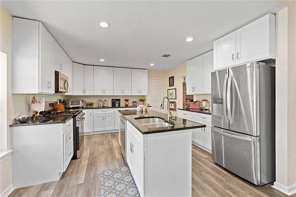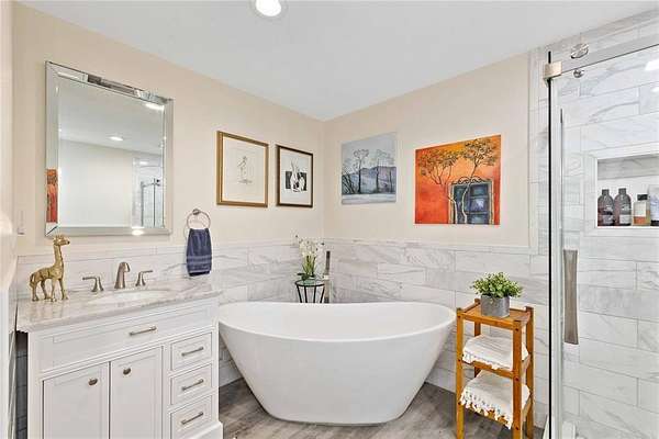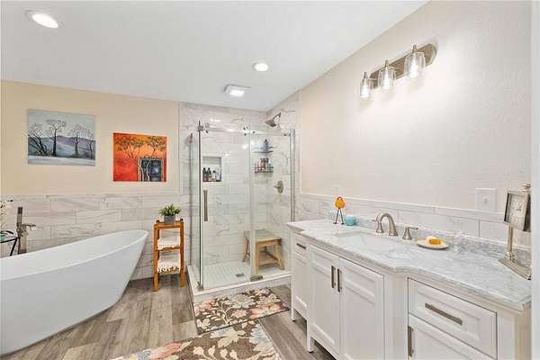 The home itself has been beautifully refreshed with a modern remodel while keeping its warm, ranch-style charm. Its long, thoughtful layout features expansive living, dining, and kitchen areas--perfect for gathering family and friends. The spacious primary suite is a true retreat, complete with a cozy sitting area and private French doors leading outside. The spa-like ensuite bathroom will exceed your expectations, featuring dual vanities, a deep soaking tub, and a separate shower--an inviting space you may never want to leave.