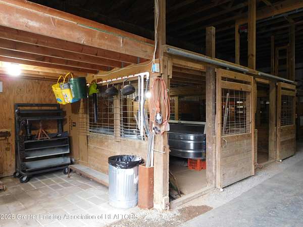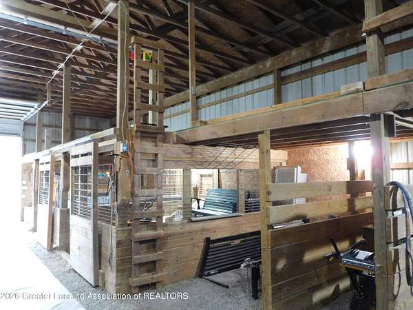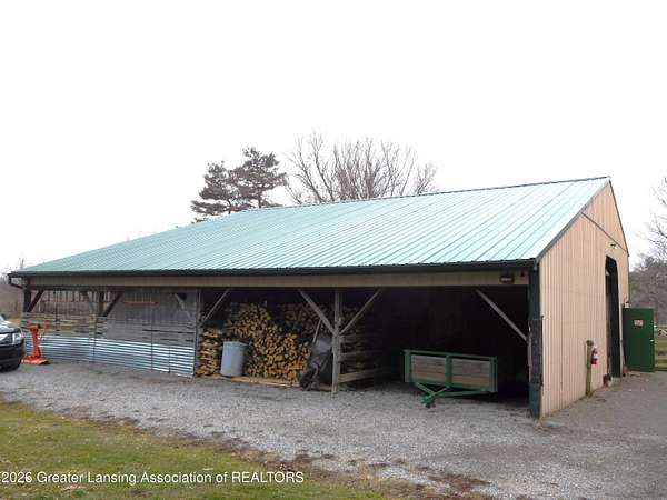 5.5 Acre lot w/ easement driveway - remote auto security gate - 3 plus bedroom walk out split level - 1.5 bath - Full bath completely redesigned w/walk in shower and quality finishes - Main floor laundry Room - Updated kitchen featuring Corian countertops and integrated sink - laminate floor - newer appliances , all included - propane/wood/solar heat - A/C - Spacious deck has 12x11 covered section - Metal Roof - Detached 4 car garage heated and insulated - Equine barn with hay loft and lean to - chicken coop and yard - hard surface slag driveway - move in condition - secluded/private beautiful setting with gently rolling views of pines and nature. Convenient central location to access freeway and just a few minutes' drive to Mason, Leslie and Jackson Pride of ownership is evident here! Kitchen features newer appliances with dishwasher about 1 year old and newer refrigerator along with quality gas range and Corian countertops. Enjoy the convenient main floor laundry room and the full bath is sure to impress featuring a large walk-in shower and lovely tile. Lower-level family room will be a spot to enjoy with wood stove and walk out to patio. 2 bedrooms, half bath and a surprising bonus room or 4th bedroom, gives great storage, and sellers use it as an oversized pantry. Water conditioner is owned. New pressure tank and new relay switch for the 4" well. Propane tank is owned. Equine barn equipped w/ 2 enclosed box stalls, tack rm and loft hay/straw storage area. Firewood in lean to is included for new owner