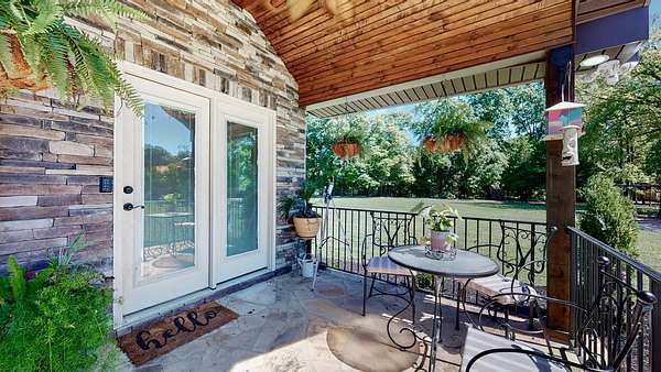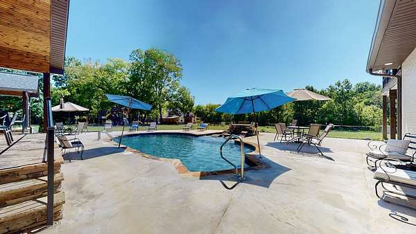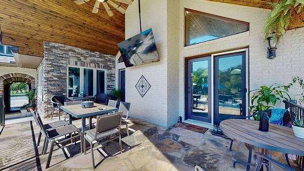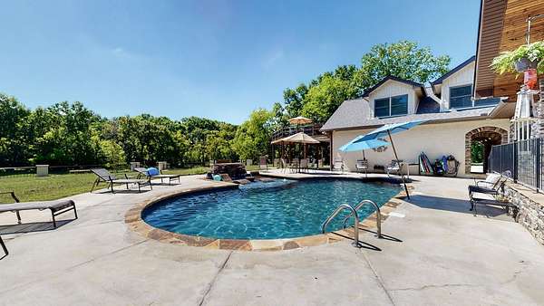 Outdoor living is equally compelling with covered patios, an expanded flagstone terrace, entertaining deck, and a saltwater pool with tanning ledge, bubblers, waterfall, and new liner. The surrounding acreage includes fenced pasture, multiple gated access points, year-round creek frontage, and a chicken coop, creating a rare blend of beauty and functionality.