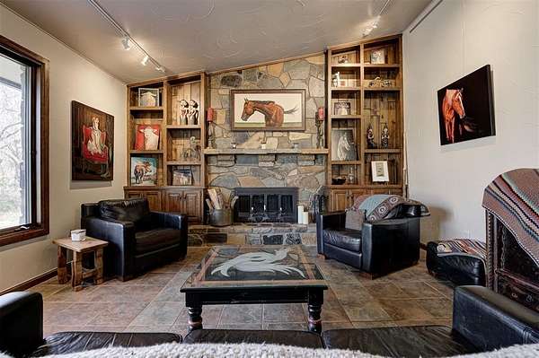 The home offers a one of a kind office/flex space featuring a wood-burning fireplace, built-in shelving, a built-in fireproof safe, and cedar walls, making this space ideal for a home office, entertaining or a cozy evening by the fire!