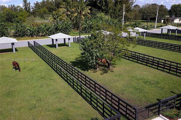 When only the best will do! This is not just an equestrian property — it’s a world-class show barn, designed for riders operating at the highest level of the sport. The 5-acre gated facility offers longevity & elite performance just 40 minutes from Miami, 1 hour from Wellington & 30 minutes from Fort Lauderdale Beach. The concrete barns feature 38 Rower & Rube stalls w/ premier footing, Nelson automatic watering systems, 24-hour surveillance & 16 run-outs. There are 12 oversized, irrigated grass paddocks w/ permanent concrete run-in sheds & fans for year-round comfort. Broward County’s largest covered indoor arena is complemented by outdoor arenas, professional dressage mirrors, a hot walker, treadmill & dry treadmill. All stalls connect to a full underground drainage system to eliminate flooding. A 3-story luxury clubhouse overlooks the arena & includes indoor/outdoor viewing areas, management offices, a bar & a beautifully appointed tack room. Above is a 2-bedroom, 2-bath apartment ideal for a trainer or owner, plus a separate 3-bedroom staff apartment & full grooming facilities. 2 trailers & equestrian equipment are included. Direct trail access connects to Vista View Park & the Florida Trail network. Near American Heritage School. New Price – Reduced from $7.9M to $7.299M.