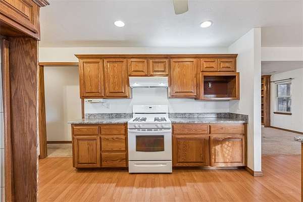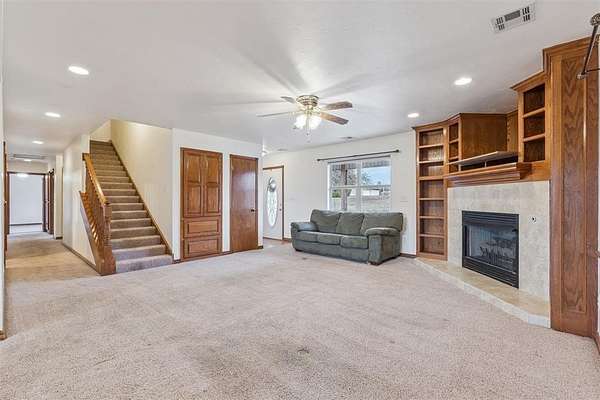 Inside, the main level features a spacious living area with a gas fireplace, seamlessly connecting to the dining area and kitchen. The kitchen includes an oven/range, disposal, generous counter space, and a sizeable pantry, with the laundry room positioned conveniently nearby.
