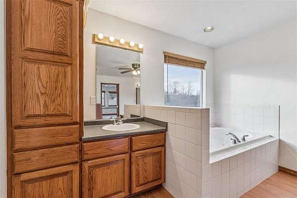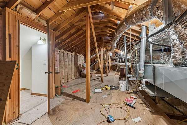 The upper level includes two well-proportioned secondary bedrooms, a full bathroom, and the primary suite, which features dual closets, a soaker tub, and a walk-in shower. Interior attic access provides additional storage capacity.
