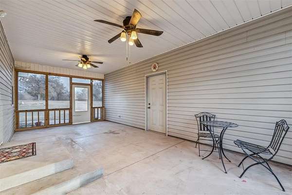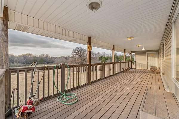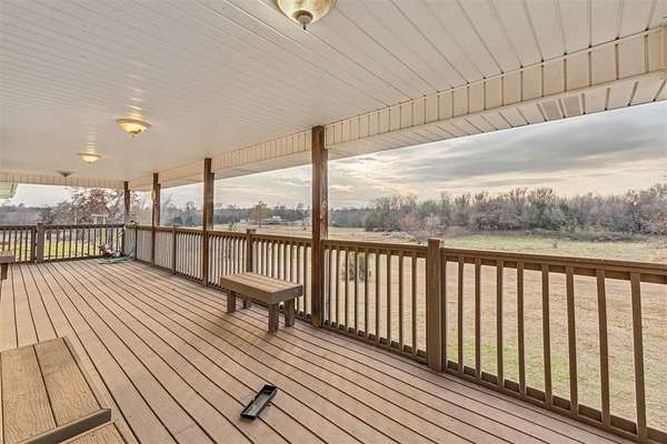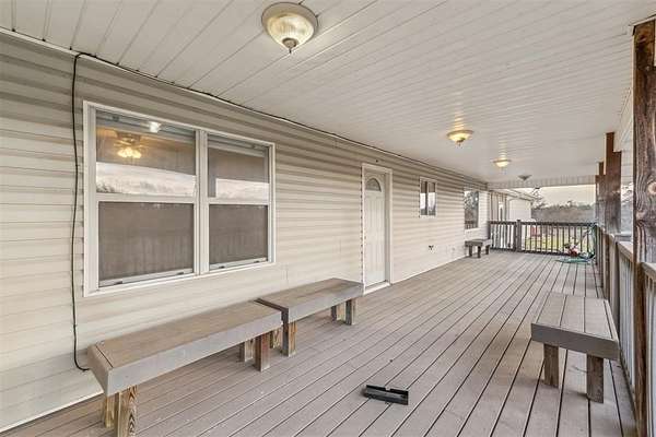 Outdoor living areas include a covered front porch overlooking the wooded landscape, as well as multiple covered patios, including an elevated upper-level patio and a ground-level patio accessible from the walkout basement. The combination of acreage, water views, and custom construction creates a rare opportunity for a private and elegant rural retreat.