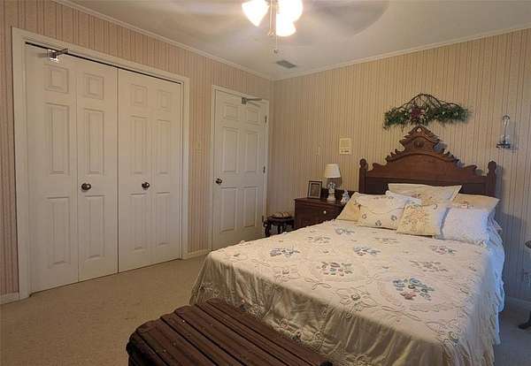 Step outside to enjoy the peaceful setting from the covered porches or the wooden deck overlooking the countryside. The exterior boasts a metal roof, beautiful mature trees, St. Augustine grass in the front yard, and plenty of parking and workspace with four carports, a four-car garage, and a workshop with electricity. The property also includes a water well and even an underground shelter.