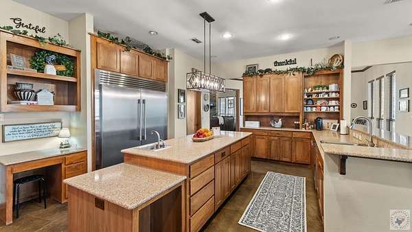 Wow, we have reduced this property to locate the perfect buyer for this estate, with it's gourmet kitchen and spacious 4 bedroom home with a Guest House, beauty meets function. This property guarantees self-sufficiency with two water sources: city water & an additional 730 ft deep well. Severe weather is no concern thanks to a backup generator that powers the kitchen appliances & backup gas heaters in the bathrooms. Stay warm and cozy with three fireplaces-two are wood-burning, & the one in the breakfast nook features gas logs for instant ambiance. Perched atop a ridge, the home offers breathtaking, miles-long views. A versatile safe room provides extra space and peace of mind, & can also function as a fifth bedroom, already plumbed for a third bathroom. The home was custom-built for maximum efficiency, featuring a wraparound porch that offers shade from the afternoon sun, a steel roof, and R-30 insulation in the attic and ceiling. Need more room for extended family? A separate 1800 sq ft shop building includes a full apartment with a kitchen featuring custom cabinets, a full bath, laundry, and a large closet. 900 sq ft is reserved for the garage/shop area & a full-length porch complete this secondary dwelling. Inside the main home, vaulted ceilings soar up to 18 feet in several living areas. The divine kitchen is a chef's dream, complete with Shaker-style custom cabinets, quartz countertops, a Sub-Zero-style refrigerator and freezer, a gas range, a desk area, bookshelves, and an icemaker less than two years old. It also features double ovens, a microwave, and a pantry, and opens to a huge laundry room perfect for large families. The expansive back patio includes a fireplace, where you can enjoy stunning, private views on this 14+ acre tract. The primary suite will wow you with its newly replaced shower with glass doors and multiple closets. Throughout the home, you'll find solid wood doors and love the low-maintenance scored concrete floors.