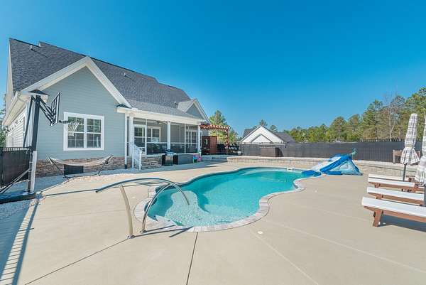 Gorgeous home loaded with high-end features on a 1.5-acre lot backing up to an additional 500-acre natural reserve. This beautifully appointed property showcases upscale finishes throughout, including hardwood floors, granite countertops, stylish lighting, custom tile work, heavy trim, and thoughtful details at every turn. This 4-bedroom, 3.5-bath home is wonderfully crafted for busy family living. The easy-step kitchen overlooks the spacious great room, creating the perfect central hub for everyday life and entertaining. Imagine summer days spent in your private backyard oasis, complete with an inground heated pool and peaceful wooded views. Enjoy seamless indoor-outdoor living with a screened-in porch ideal for outdoor gatherings, leading directly to the pool deck. A unique exterior water closet adds exceptional convenience for pool guests. The garage includes a workbench and built-ins that offers storage galore. Every detail of this home reflects comfort, functionality, and upscale design, all set against a serene natural backdrop. Nestled in a charming gated community, you'll enjoy the serenity of country living with the convenience to many local amenities.