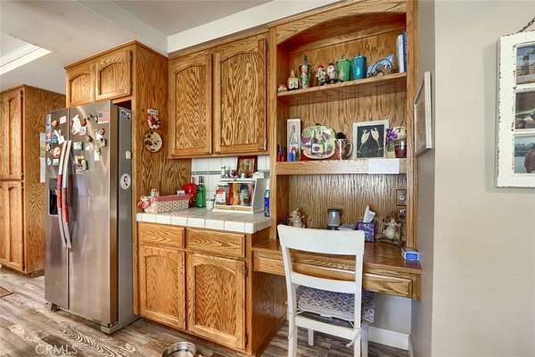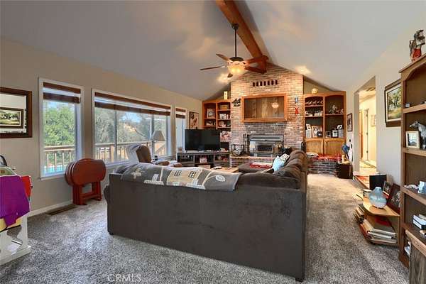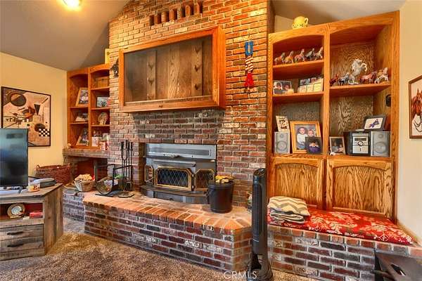 The home itself welcomes you with a lush, mature landscape and a shaded front yard perfect for relaxing or entertaining. Step inside to a spacious living room with soaring open-beam ceilings and a dramatic floor-to-ceiling brick fireplace--complete with a wood-burning insert that keeps the whole house cozy. Built-in bookshelves and a custom wood nook add charm and function.