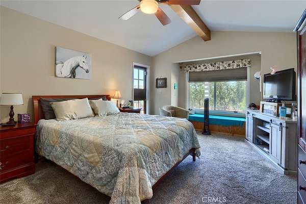 The formal dining room, currently set up as a home office, features a Dutch door leading to the redwood deck--partially covered for year-round enjoyment. The primary suite also has vaulted ceilings with exposed beams, a cozy window seat, and a French door opening to the back deck. The en-suite bathroom is your personal retreat, featuring a large walk-in shower and a luxurious jetted soaking tub.