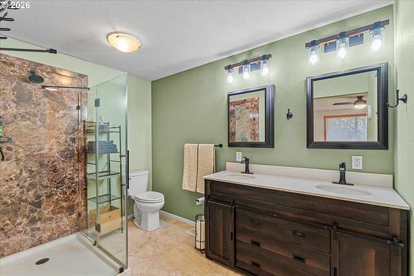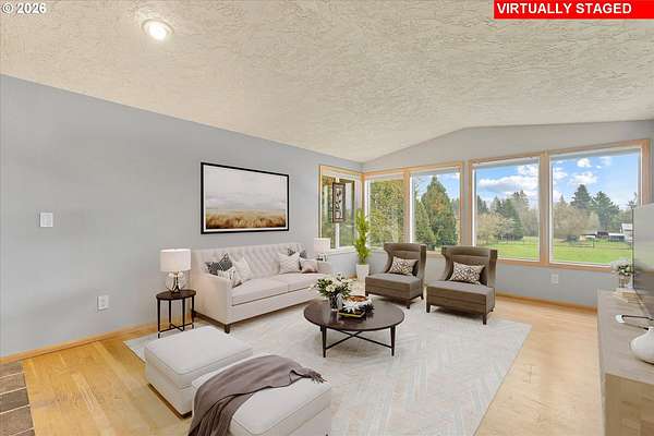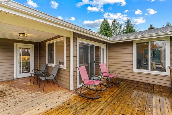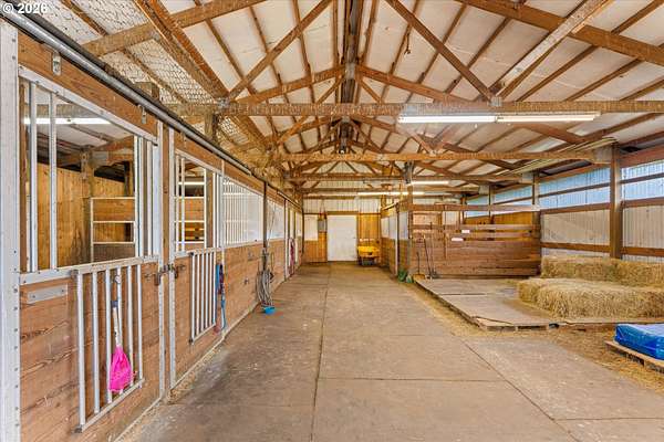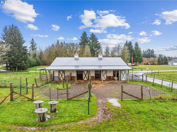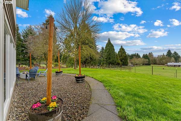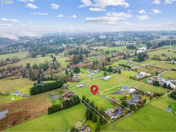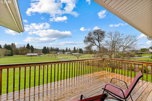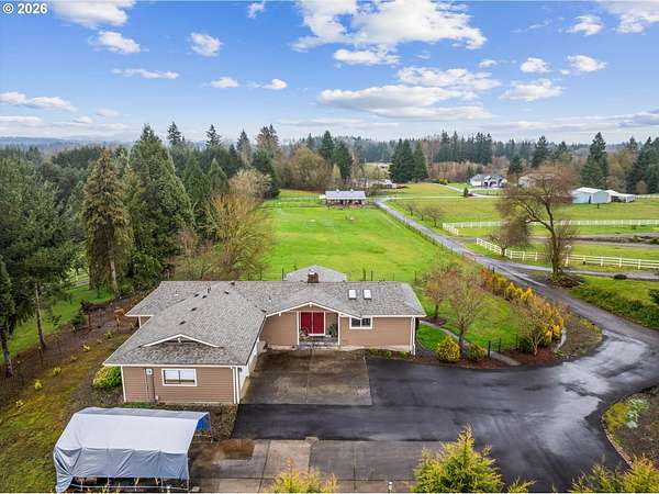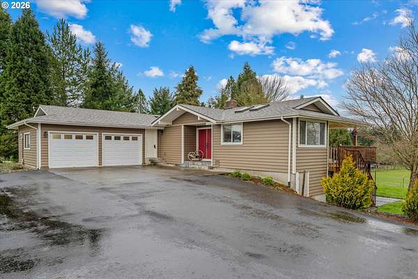 Nestled on 2.46 acres in a quiet, well-established setting, this spacious 3,036 SF daylight ranch offers the perfect blend of comfort, flexibility, and mini-farm living. The home features a brand-new kitchen, 5 bedrooms, and private in-law quarters complete with a second kitchen and separate exterior entrance, making it ideal for multigenerational living or extended guests. The primary suite provides a relaxing retreat with a barn door entry and walk-in shower. Recent updates include: New vinyl siding (2019), new deck (2020), new garage (2024), newly repaved driveway (2025) and full roof replacement (2019). Equestrian and hobby-farm enthusiasts will love the impressive 30x60 barn with 5 stalls, complete with water service, water heater, and its own electrical panel, along with a fenced pasture area for animals. The property offers room for RV parking and operates on private well and septic, providing both independence and functionality for rural living. Enjoy beautiful east-facing views of Mt. Hood and the tranquility of country living while being conveniently located near Bethany Vineyard, 14 Acres Winery, and 3 Peaks Brewery, making it easy to enjoy some of the area's best local wine and craft experiences.