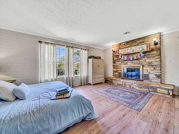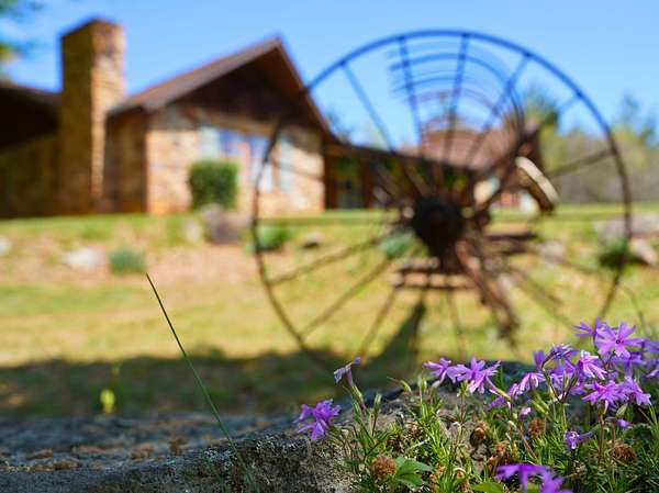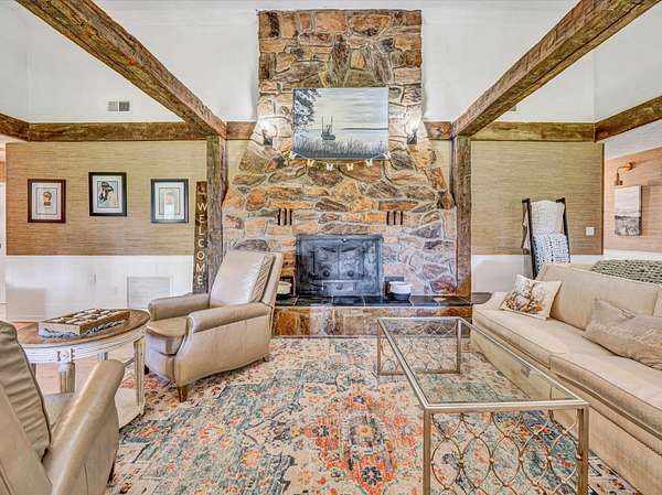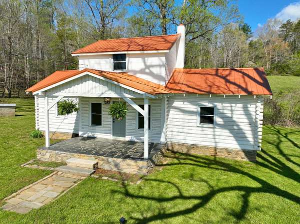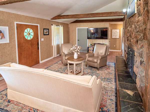 The property boasts two bucolic homes, each with its own story. The main residence, a 4-bedroom, 2-bath stone and cedar shake home built in 1977, sits high on the land with nearby mountain views. Crafted by a master stonemason using rock pulled straight from the property, this home has been thoughtfully updated without losing its original character. Inside, you'll find premium LVP flooring throughout, a remodeled kitchen with butcher block countertops and a farmhouse sink, fresh paint and shiplap wall installations, renovated bathrooms, new HVAC (2023), and upgrades to the pool and mechanical systems (2022/2023). Still, the home holds onto its roots, featuring stone fireplaces, hand-hewn exposed beams, and grasscloth walls that add texture and warmth. At the front of the property, a circa-1900 log cabin cottage has been restored on the exterior with a new copper metal roof (2023), doors, and windows, and is ready for your interior vision. It's the kind of guest space or retreat that invites creativity.