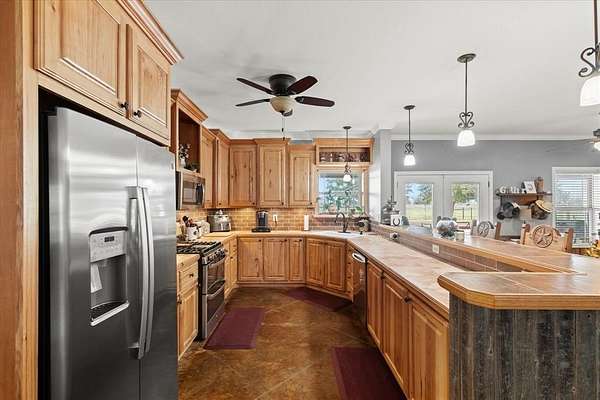 The kitchen is designed for both everyday living and entertaining, showcasing solid wood custom cabinetry, granite countertops, bar-top seating, and two oversized pantries or appliance storage areas. Step outside to the stunning 20x40 covered patio--an incredibly peaceful space overlooking the land and the perfect setting for relaxing evenings or hosting gatherings.
