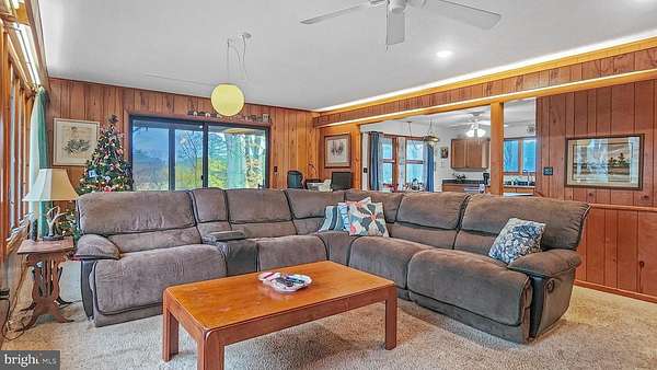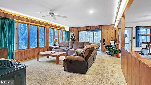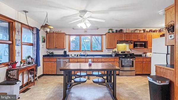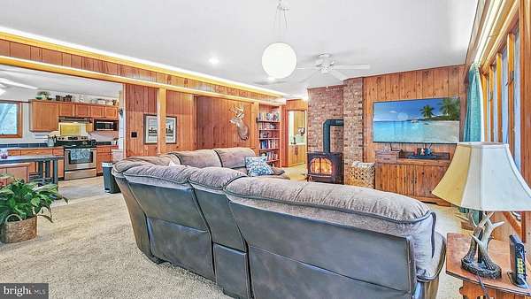 - Ceiling Fan(s), Combination Kitchen/Dining, Country Kitchen, Entry Level Bedroom, Open Floor Plan, Primary Bath(s), Window Treatments, Wood Stove