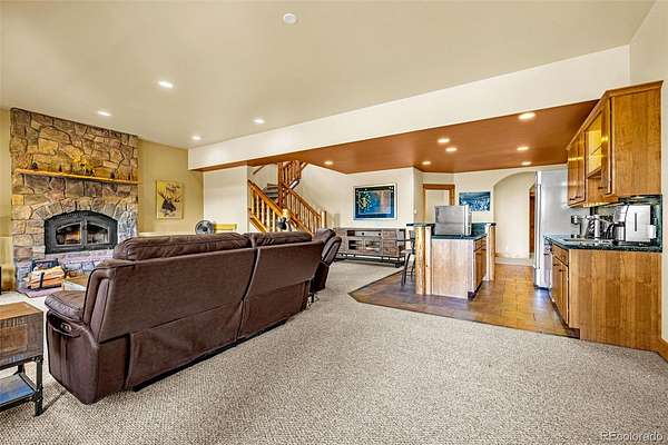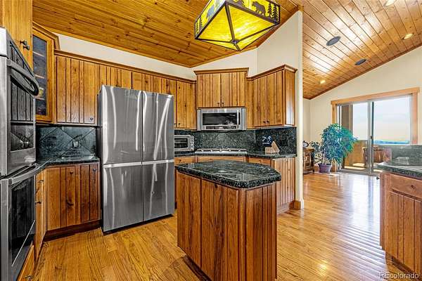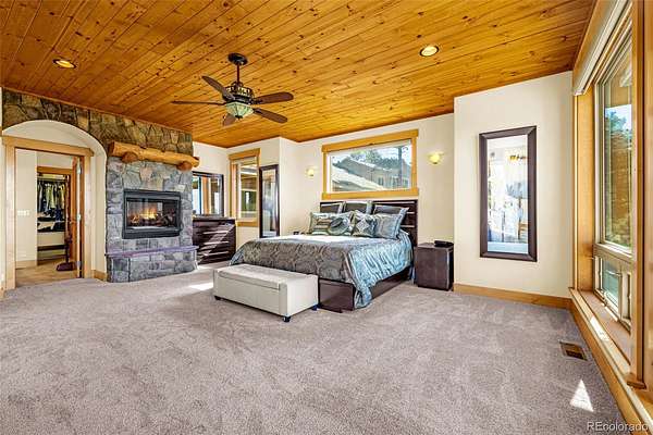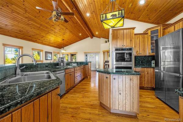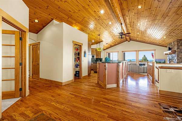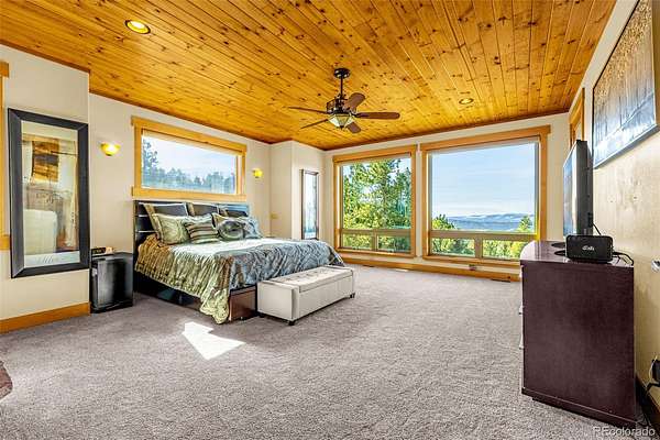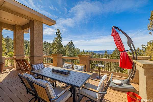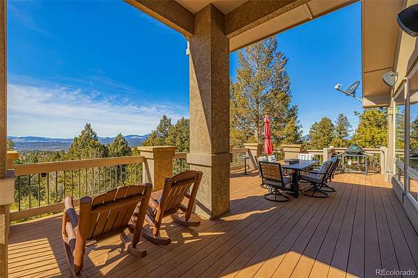 Experience refined mountain living in this stunning custom-built home, where craftsmanship and quality shine throughout. Perfectly positioned to capture sweeping views of the Sangre de Cristo Mountains, this property offers true main-level living on 3.08 acres. From the moment you step through the front door, your eyes are drawn straight through the open floor plan to the breathtaking views beyond the expansive composite deck. The main level features rich hardwood floors, a tongue-and-groove ceiling, and custom log railing details that blend elegance with mountain character. The open-concept living, kitchen, and dining areas are ideal for everyday comfort and entertaining alike. The living room showcases a dramatic floor-to-ceiling rock gas fireplace, while the kitchen is equipped with new stainless steel appliances including a cooktop and dual wall ovens, plus a generous walk-in pantry. The primary suite is a private retreat, complete with deck access, oversized picture windows that feature new electric shades, and a two-sided fireplace shared with the luxurious en-suite bath. Relax in the large soaking tub with the fire going or enjoy the expansive walk-in shower. A spacious walk-in closet completes the suite. A second bedroom is currently used as a home office with glass French doors and great closet space. Also on the main level: a powder room and an oversized laundry room with utility sink and abundant cabinetry for storage, which walks out to the 4 car attached garage. The walk-out lower level offers exceptional additional living space, including a large family room with a second gas fireplace and an oversized wet bar perfect for entertaining. Three additional bedrooms are located downstairs, two with attached bathrooms, and all featuring large or walk-in closets. A second laundry/storage room and an enormous utility room provide incredible functionality. This is Colorado mountain living at its finest—privacy, space and views that never get old.