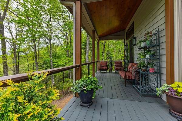 This impeccably maintained custom home in gated Whitewater Ridge community presides over beautiful gardens and offers a stunning long range Whiteside Mountain view. The 11 acre estate is surrounded by thousands of acres of National Forest, offering three hiking trails and access to waterfalls and the wild and scenic Whitewater River. Its setting among the native rhododendron and mountain laurel offers both privacy and quiet found in its natural surroundings. Throughout the home, you'll find thoughtful design and exquisite attention to detail. The main living areas are oriented to maximize the spectacular views, and the covered porch and decks feature unobtrusive post and cable railings. The great room is a highlight, with its soaring wood cathedral ceiling, wood floors, and a floor-to-ceiling stone and Italian tile wood-burning fireplace. The chef's kitchen is equipped with Thermador appliances, dual workstations, and ample ceiling-height cabinetry. A large pantry with an additional refrigerator/freezer, beverage cooler, adjustable shelving, and a recycle center is conveniently located nearby. The spacious primary suite located on the main level features a cathedral ceiling, a linear gas fireplace, custom maple and cherry cabinetry with a "waterfall" design, a zero-entry shower, and a heated bathroom floor. On the opposite side of the home's main floor, a private guest suite awaits, complete with wood floors, abundant natural light, a large closet, and an en-suite bath. The main level also includes a generous laundry room, a powder room, a home office and a small keeping room with a gas fireplace adjoining the kitchen. Upstairs, you'll find two additional bedrooms and a spacious bathroom with double vanities and a tub. A large family room is situated above the two-car garage. The lower level, built into the sloping terrain, offers an art room, extra storage space, a third garage for an ATV and easy access to the home's mechanical systems. This exceptional estate also features desirable amenities such as a 22Kw generator, a whole-house water filtration system, a dual fuel heating system, and energy-efficient spray foam insulation in the walls and ceilings, ensuring comfort and peace of mind.