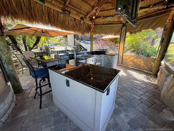 STUNNING NORTH-FACING PULL-IN LOT WITH WATER VIEWS! This lot is a true gem, offering panoramic views of two lakes, the golf course, and a beautifully lit waterfall. Fully pavered and the well-established landscaping is enhanced with upgraded lighting and upgraded watering system, creating a serene and picturesque setting day or night. At the heart of the property is a spacious tiki hut with an isinglass enclosure, treated support posts, and hurricane straps, ensuring durability and comfort in all weather. The kitchen is a chef's dream, featuring granite countertops, an Alfresco grill, stainless steel sealed pantry, drawers, sink, and 6 bar stools with plush cushions provide the perfect seating for entertaining. The tiki was re-thatched in September 24 and a 65" TV is included as well as a cozy sofa and outdoor dining set. Additional highlights include a custom-made full bar cover, storage shed, and thoughtful attention to every detail, ensuring both practicality and luxury.