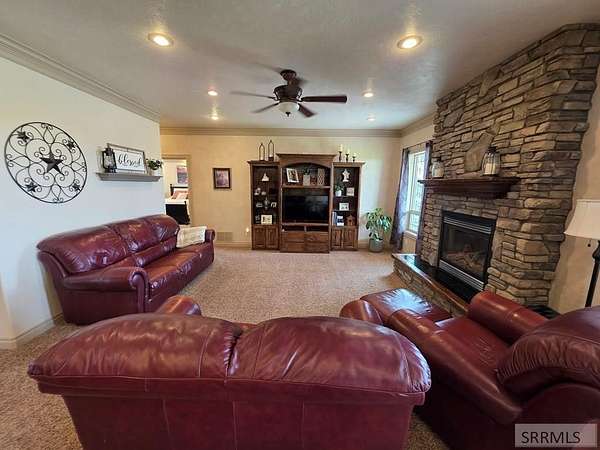 Welcome to this beautiful country home on just under 5 acres in the desirable Burton area, a property that offers both comfort and room to grow. The kitchen is the centerpiece with two-tone cabinetry, spacious island, built-in cooktop, double ovens, and all appliances included. It opens to a bright dining area and cozy family room with a gas fireplace. The main level also features a guest bedroom and full bath, along with a primary suite offering a dual-sink vanity and walk-in tile surround shower. A generous laundry room with built-in shelving adds convenience. Upstairs you'll find three bedrooms, a full bathroom, a built-in office center, and a theater room with kitchenette ideal for entertaining or relaxing. Outdoors, the property is fully landscaped with a sprinkler system, garden space, and greenhouse. The garage has two doors but is deep enough for a third vehicle and includes a finished utility closet with extra sink. Updates include a new pressure tank and switch (2023), a natural gas mainline along the north side, and a septic system serviced in 2024. For animals, the acreage is ready to go with a huge barn featuring an insulated tack room with sink, an upper level for flexible use, and 5 corrals each with water access. The property also qualifies for the AG exemption.