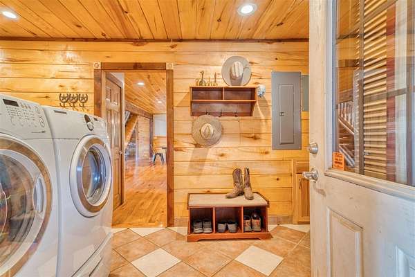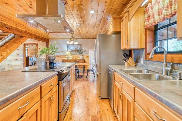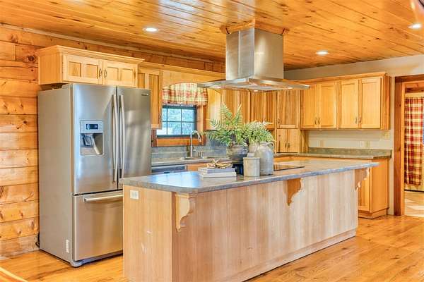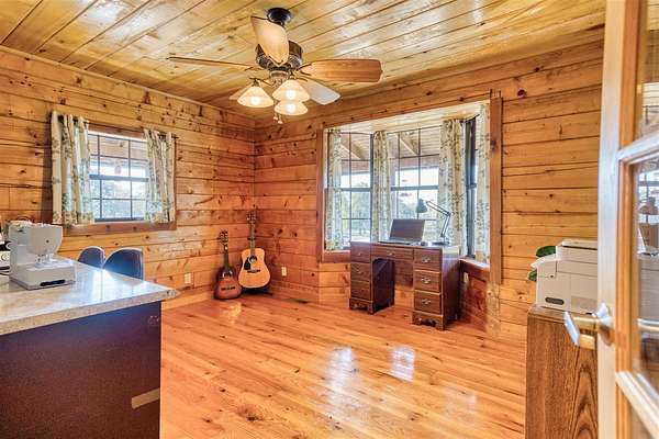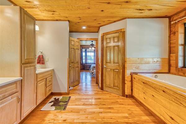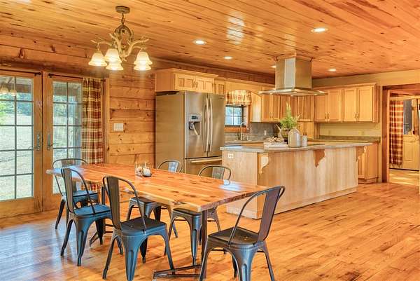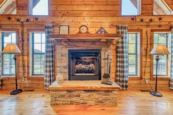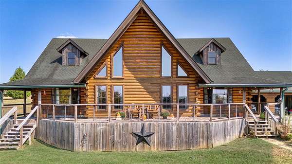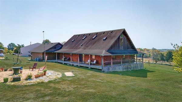 Tucked away in the serene countryside of Russellville, KY and located in the Adairville school district, this stunning log home offers the perfect blend of rustic charm and modern comfort on 7.9 partially wooded acres. Crafted from hand-harvested Engleman Spruce logs sourced from the Rockies, this home boasts unmatched craftsmanship and attention to detail. A full wrap-around porch invites you to take in panoramic views that stretch all the way to the state line—on clear days, the scenery is breathtaking, and come July 4th, you’ll enjoy a front-row seat to fireworks lighting up the horizon in every direction. Inside, the home features four spacious bedrooms—two on the main floor and two upstairs—with ensuite bathrooms in both the primary and upper-level bedrooms. An additional full bathroom on the main level offers convenience for guests and easy access to the nearby laundry room, which includes a built-in ironing board. The home is equipped with two HVAC units, four skylights, and generous walk-in closets throughout. The kitchen is a chef’s delight with custom hickory cabinetry, all lower cabinets featuring pullout shelves, and a spacious pantry closet. Aspen wood ceilings and walls throughout the main floor pair beautifully with clear-coated red oak flooring. The centerpiece of the living area is a beautiful gas fireplace, featuring sandstone from local Costello Stone and finished with decorative rock. It's fully automatic and includes two emergency shut-off valves for safety. In the master suite, you'll find maple flooring and cabinetry, as well as additional aspen woodwork. The master bath includes his-and-hers walk-in closets and a luxurious Jacuzzi tub with an auxiliary heater to maintain a consistent water temperature. An oversized two-car garage offers plenty of room for vehicles and storage, while a massive 60x40 detached garage/workshop with a concrete floor is ready for your projects—already plumbed for a bathroom and wired for electricity. There’s also a fenced dog area for your four-legged friends. Due to home built with logs, floors have to occasionally be adjusted to level. Seller has a lifetime warranty through a specific company that will transfer to buyer. Ask agent for information.